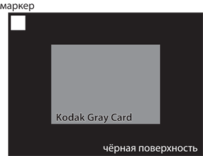 Тест на светочувствительность. Теперь, зная сколько нужно плёнку проявлять, можно протестировать её на светочувствительность. Обычно делаю так: 1. Серую карту кладу на чёрную поверхность, таким образом, чтобы карта занимала 50-70% кадра, а чёрное поле всё остальное. Чёрное поле должно быть темнее серой карты на 2 ступени. С краю чёрного поля кладу что-нибудь белое, чтобы всегда можно было различить границы кадра. Поле съёмки должно быть освещено равномерным рассеянным светом, яркость и цветовая температура которого не должны меняться в течении теста.