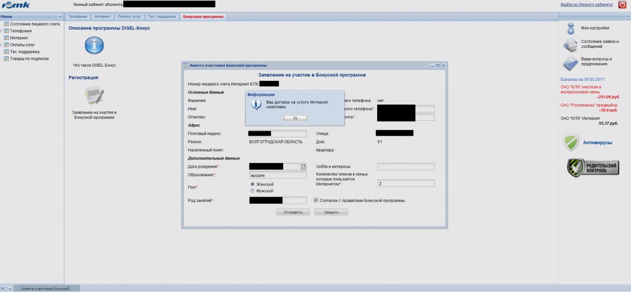 при наличии отсутствия технической возможности и свободных портов на станции видеть вотето уже радостно. Наталья помогает. (на ЮТК 1й день - на бесптичье и ж..а соловей не через 3жы мамед же сидеть) ---------- Сообщение добавлено 10.03.2011 22:54 ---------- + ктонеть объяснит мне, как войти в этот самый личный кабинет на st.mycompany.ru - вводить логин/пароль надо с карточки (логин вида dslpp и ещё 6 цифр и пароль)? Почему он мне тогда выдает "Неверный логин! Попробуйте снова блаблабла"?