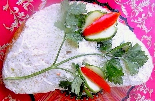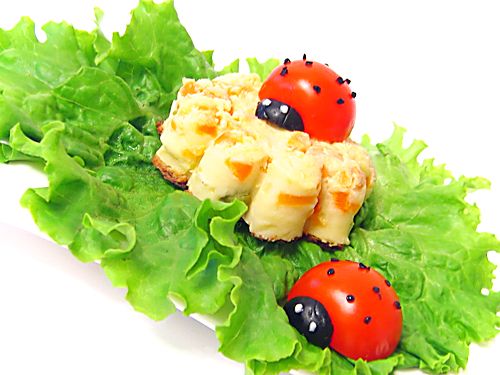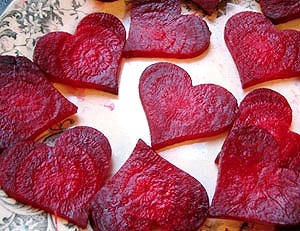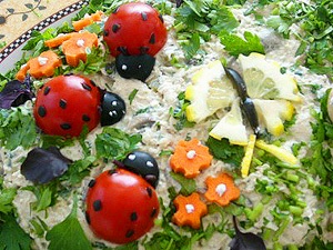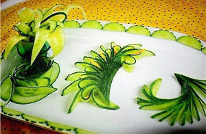 • свекольные сердечки - вырезаются из вареной свеклы специальными формочками, используют для украшения салатов, особенно, если хотите поразить любимого человека, или в день св.валентина) • стрелки зеленого лука, разрезанные вдоль, сами собой свернутся в красивые «кудри», а если погрузить их на несколько секунд в холодную воду, то эффект усилится, причём, чем холоднее вода, тем более скрученными будут полоски • украшения из огурца, при нарезке огурец не должен быть слишком холодным
