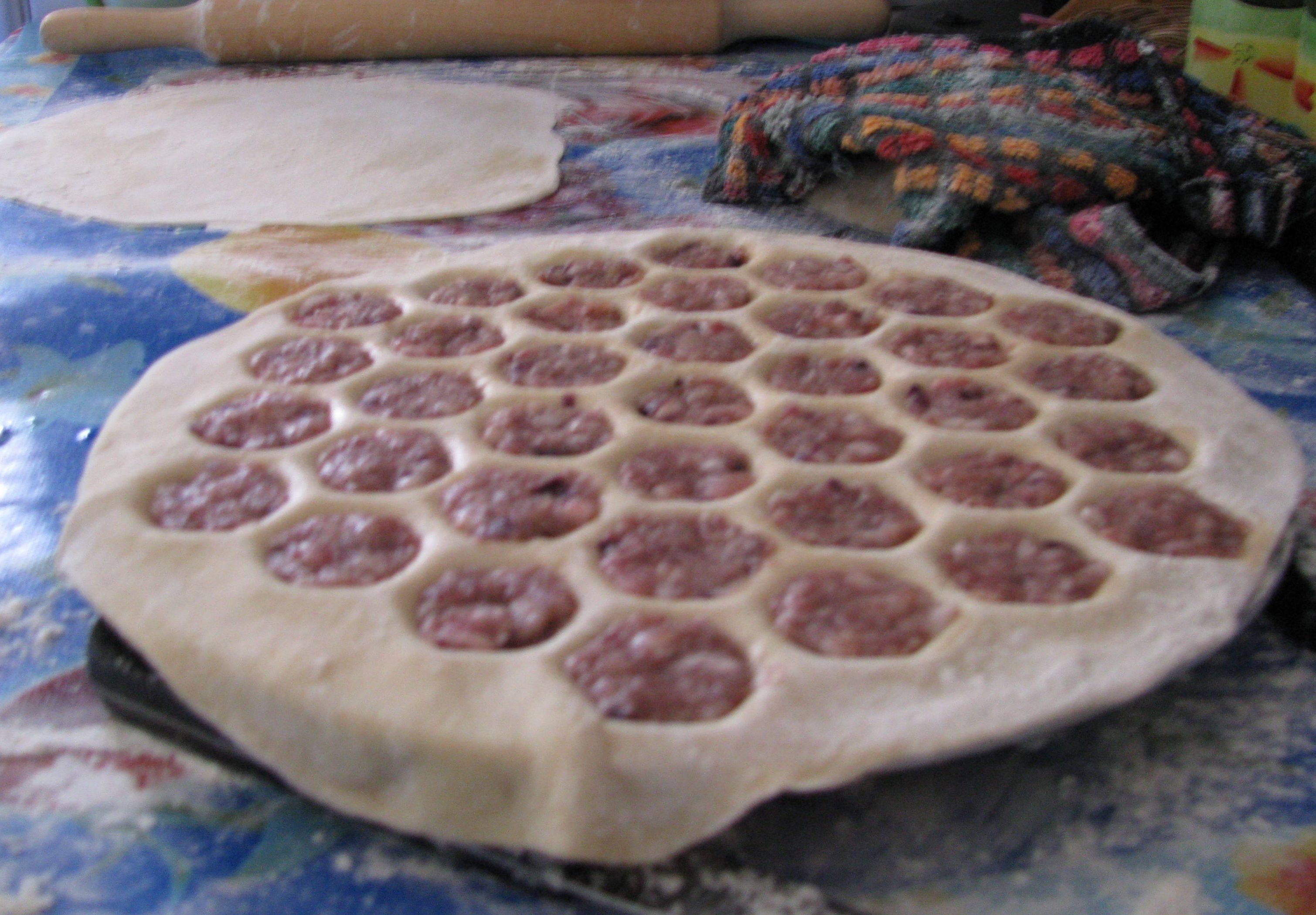 А я делаю что-то вроде хинкалей. Фарш - телятина, баранина (никакой жирной свинины!), много лука, перец, соль, кинза, немного чеснока. Тесто на глаз замешиваю руками. Ребенок настолько привык к домашним, что магазинные не признает.