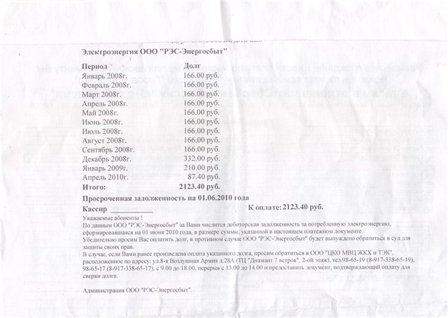 А нам принесли квитанцию о задолжности на сумму 2123.40. Якобы мы не платили весь 2008 год, январь 2009, апрель 2010. Суммы за каждый месяц вообще взяты с потолка, платили в 3 раза больше этих сумм. Раньше одной платёжкой мы платили за воду, свет и вывоз мусора. Позвонила узнала есть ли долг за воду и мусор-долгов нет. Дурдом. Звонить в энергосбыт без толку, трубку не берут.