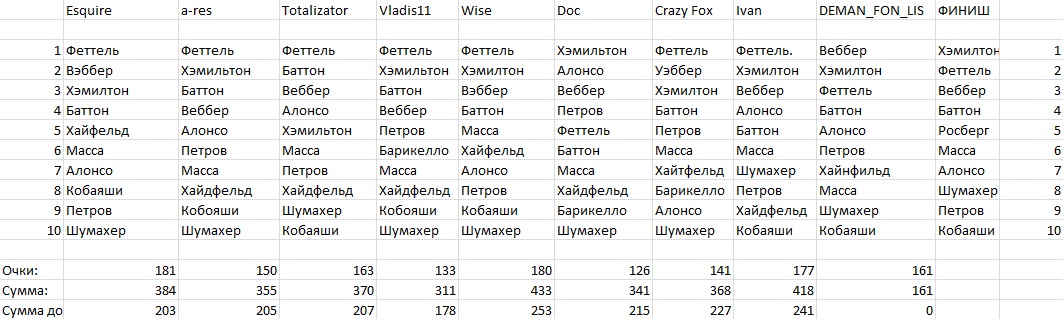 Поздравляю Esquire, угадал места 4 гонщиков. Esquire - 181 Wise - 180 Ivan - 177 Totalizator - 163 DEMAN_FON_LIS - 161 a-res - 150 Crazy Fox - 141 Vladis11 - 133 Doc - 126