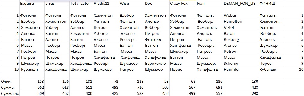 Esquire, я ток приехал с отпуска, ща накатаю. ---------- Сообщение добавлено 28.05.2011 23:02 ---------- 1. Хэмилтон 2. Феттель 3. Алонсо 4. Вэббер 5. Баттон 6. Масса 7. Шумахер 8. Петров 9. Хайдфельд 10. Кобаяши