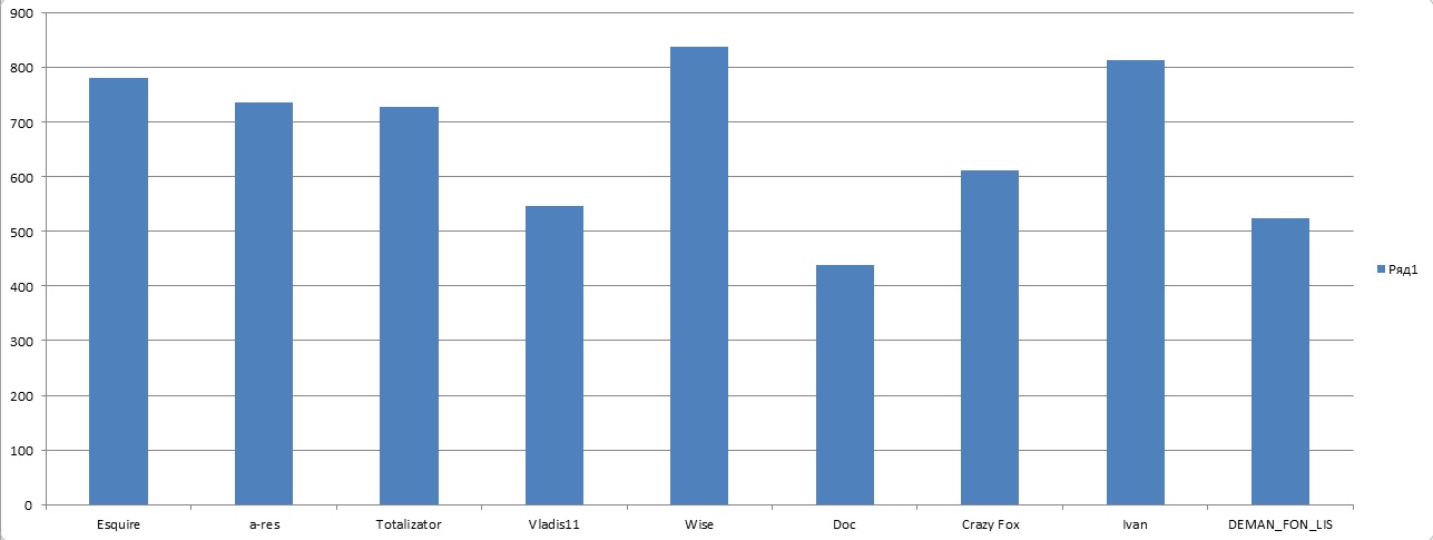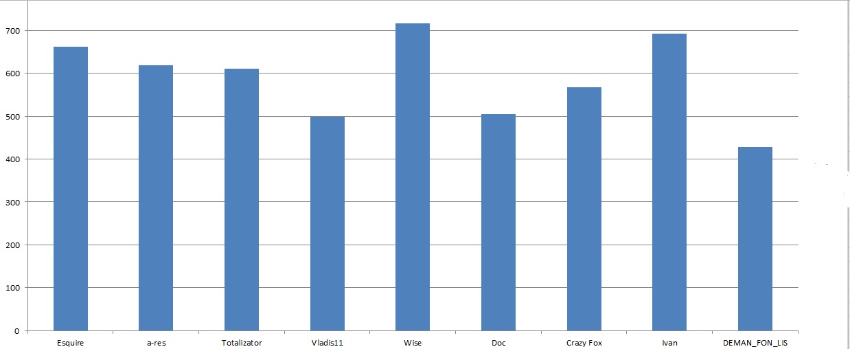 Результаты: DEMAN_FON_LIS - 97 a-res - 119 Wise - 123 Totalizator - 118 Esquire - 119 Ivan - 120 Если считать пред-предыдущие прогнозы, то результаты оставшихся троих: Crazy Fox - 90 Vladis11 - 98 Doc - 123. Максимально (по 3 места) угадали Doc и Totalizator.