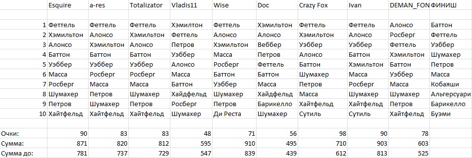 Поучаствую один раз: 1 Феттель 2 Алонсо 3 Хэмилтон 4 Петров 5 Росберг 6 Уэббер 7 Шумахер 8 Баттон 9 Хайфельд 10 Масса