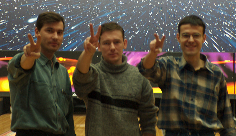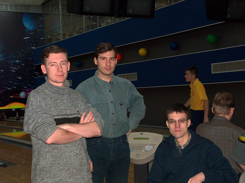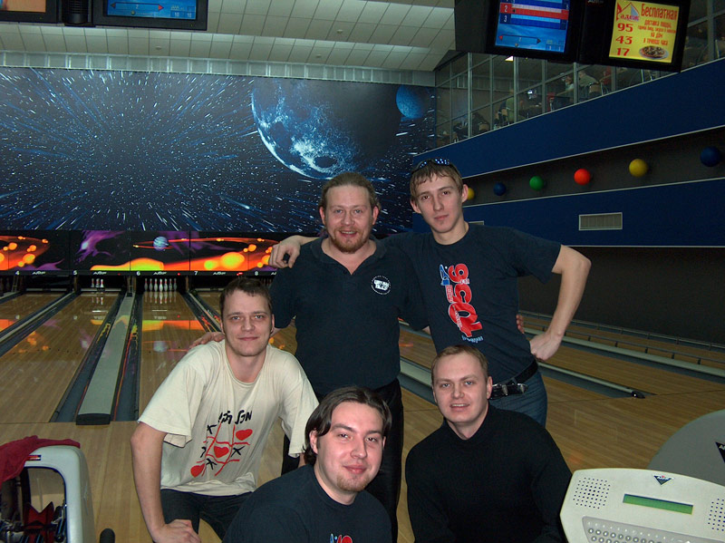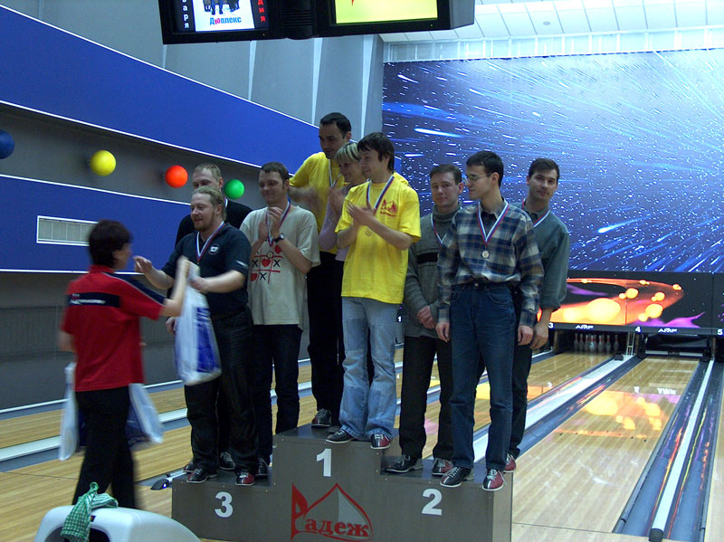 Мое субъективное мнение - участие и выигрыш в турнире "Друзья Радежа" команды смого ТРК "Радеж" выглядело несколько... мммм... пошловато. Тем более, что за них играла девушка Алла - чемпион края среди женщин по боулингу. Так что получился турнир профессионалов с любителями. Но наши мальчики дрались, аки львы! В последнюю игру я все пальцы себе вывернула, держа за них одновремено фигушки и пальцы "крестиком", да еще и подколдовывая одновременно В обчем, как впрочем и всегда - наши СУПЕР!