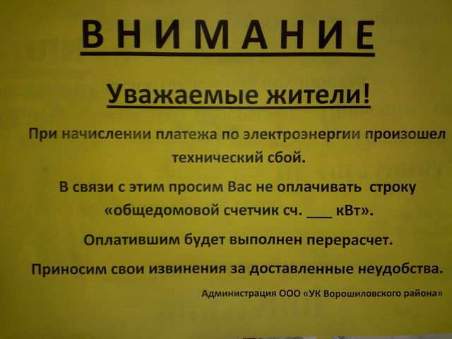 Тупое, вообще объявление. Ведь строки - общедомовой счетчик и нет... Есть общая - кв и общ. а мне всё равно, я им теперь вообще не плачу за эл.энергию. Лишь бы вернули 500 руб, которые поспешил заплатить первый раз, за февраль... Кстати, они и не имели права брать за свет никогда. Всё уплаченное им за 8 месяцев, а это почти 4 000 руб, энергетики теперь записали в долги, хотя успокоили, что можно особо не париться. поскольку есть квитанции, и теперь они с УК судятся.