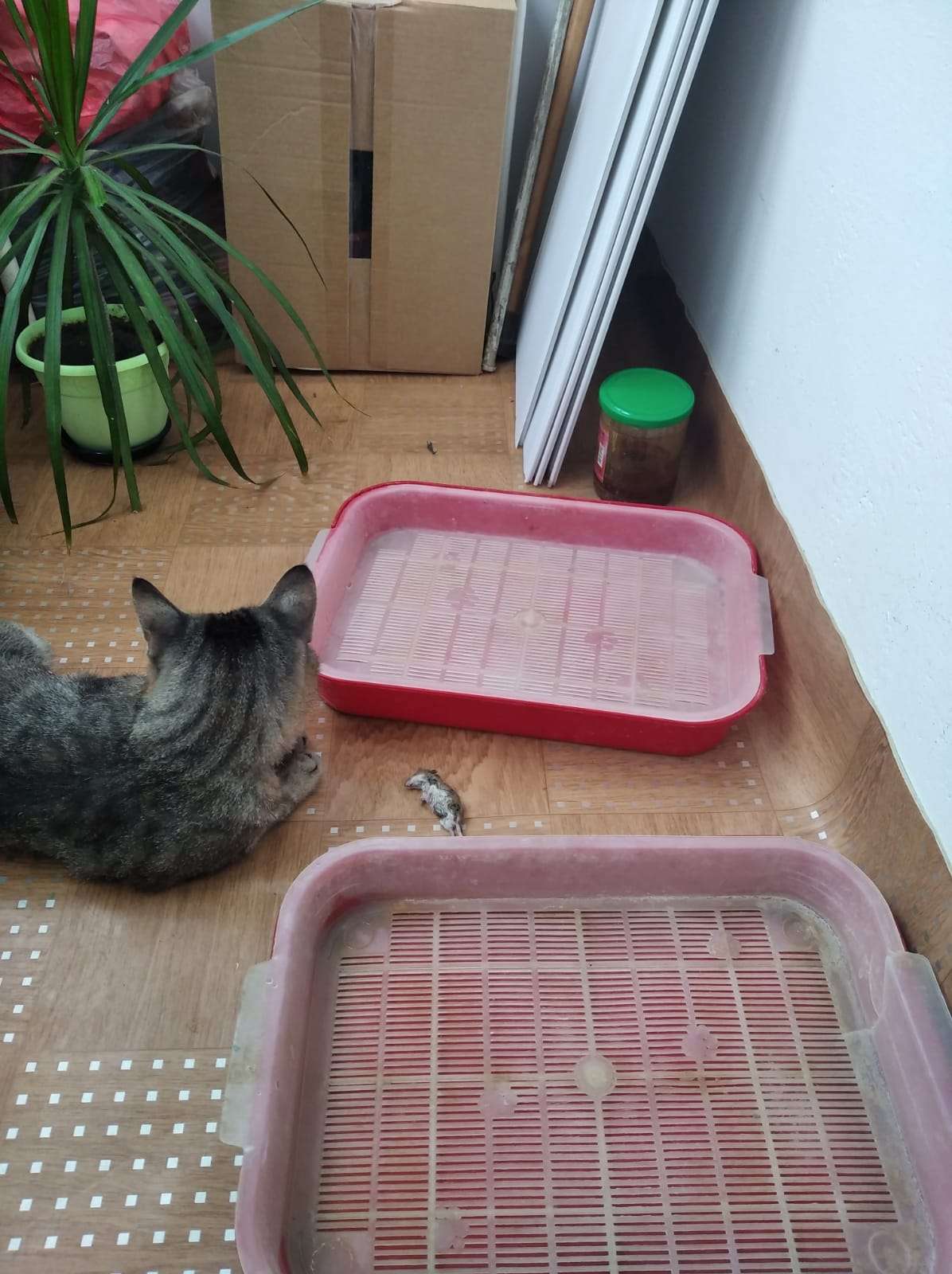 Знакомая отца пожаловалась что у неё в квартире(9эт) завелись мыши и попросила что бы я откомандировал ей свой спец.наз которые мышей никогда не видели, но очень хотели и вот пришло их время, за ними приехали, загрузил обоих с лотками и отправил. Квалификацию подтвердили, мыши были изловлены. Но вот тренировки между поимкой преступников убедили хозяйку, что котов заводить она не готова.