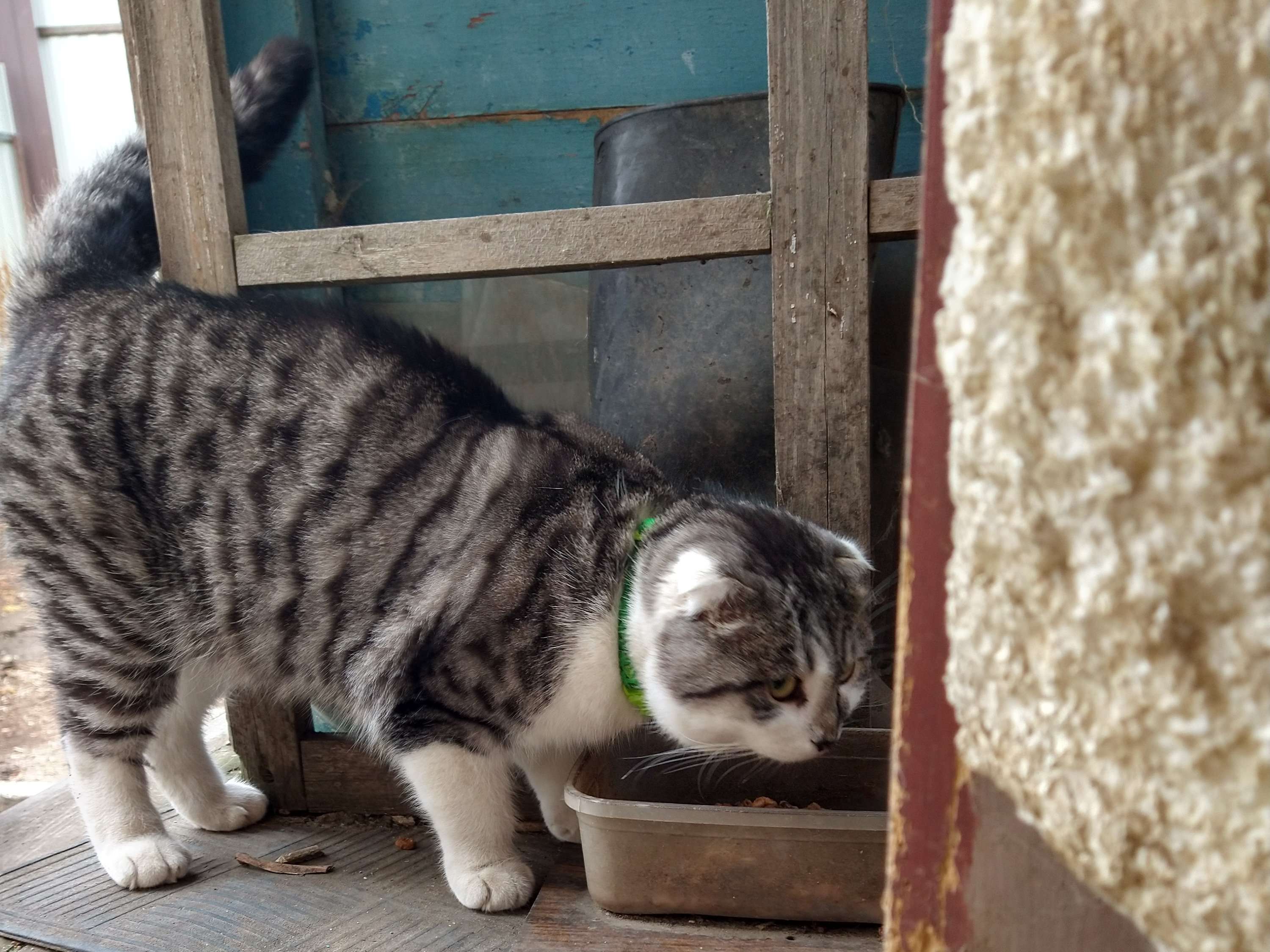 Это он в прошлом году. Жрет мой корм на крыльце, сволочь, и на меня же бурчит злобно. А я всего лишь смотрю на него через приоткрытую дверь. Я писал тут. У меня задрали мою кошку и еще одну, приблудную, приходила кормиться из той же кормушки. Это только то, что я видел. В тот же сезон пропали еще пятеро прихлебателей. А потом ко мне пришел Кот. (Это имя у него такое, кто выше не читал. Я не заморачивался.) Через полгода мне пришлось его лечить от воспаления бедра, получил в драке укол когтем. Серьезно воспалилось, операция под наркозом, сутки в стационаре, две недели дома в воротнике, чтоб не разлизывал ранки — дырки для дренажа после операции. Уже шел на поправку, но сбежал. Как был, в воротнике. Проблема в том, что на улицу он спрыгнул с забора, а пролезть под забор, в контролируемый мною лаз воротник не позволяет. То есть, вернуться самостоятельно никак. И его погрызла собака. Еще две недели в воротнике, вот же дурень такова цена свободы. Очень надеюсь, что опыт этот он не забудет. Все это время вислоухий свободно шлындал по улице, и всех бед с собаками избежал. Я ж говорю, осторожный, сволочь и недоверчивый. Долго он ко мне присматривался, пока не убедился, что братану его молочному — Коту — живется у меня зашибись. А когда осознал, начал яростно ломиться ко мне в дом. (Вы прослушали краткое содержание предыдущих серий.)