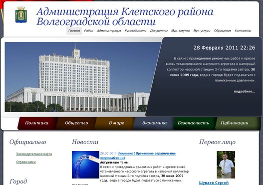 Радует такое внимание жителей Клетского района к нашей работе. С удовольствием отвечу на ваш вопрос. Дело в том, что еще в феврале 2009 года президент подписал ФЗ-8, в котором, если опустить бюрократические подробности, каждый орган федеральной, государственной и муниципальной власти должен иметь свой сайт, на котором публиковать информацию по огромному перечню. Областная и городская администрации, облдума и горсовет, разумеется, требования выполнили. А вот в районах все несколько хуже. Требования те же, граждане тоже имеют все права, а открытости власти нет. ИНТЕРВОЛГА делает сайты для районных администраций, и судя по отзывам заказчиком и жителей районов, делает это хорошо. Второй семинар 18 ноября 2010 года, который мы провели по этой теме, собрал 61 человека из области. Мы сайтов для госсектора сделали уже десятка полтора, нет статистики под руками. Что касается Белого дома, вы увидели неадаптированный шаблон госсайта, он был некоторое время доступен. Сейчас коллеги из Клетского района подберут фотографии и наполнят сайт и он будет открыт. Как я понимаю, вы с Алексеем, менеджером проектов ИНТЕРВОЛГИ, общались по этим вопросам. Тема правда интересная, например в Волжском и Городище достаточно активно поступают и обрабатываются обращения граждан. А Палласовский район для города, района и сельского поселения делает сразу 3 сайта. Телефон наш известен, позвоните. Меня зовут Степан, сотовый мой тоже не тайна.
