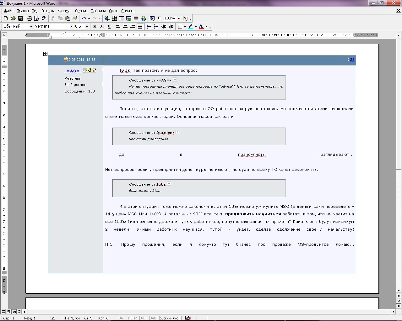 IvUs, так поэтому я из дал вопрос: Понятно, что есть функции, которые в ОО работают из рук вон плохо. Но пользуются этими функциями очень маленькое кол-во людей. Основная масса как раз и да в прайс-листы заглядывают... Нет вопросов, если у предприятия денег куры не клюют, но судя по всему ТС хочет сэкономить. И в этой ситуации тоже можно сэкономить: этим 10% можно уж купить MSO (в деньги сами переведете - 14 х цену MSO Или 140?). А остальным 90% всё-таки предложить научиться работать в том, что им хватит на все 100% (или выгодно держать тупых работников, попутно выполняя их прихоти? Какать они будут максимум 2 недели. Умный работник научится, тупой - уйдет, сделав одолжение своему начальству) П.С. Прошу прощения, если я кому-то тут бизнес про продаже MS-продуктов ломаю... ---------- Сообщение добавлено 30.03.2011 12:39 ---------- тем, кто приходит на работу за з/п, а не тем, кто вкладывает в дело собственные деньги. ---------- Сообщение добавлено 30.03.2011 12:45 ---------- А зачем это нужно (это вопрос, а не подкол)? Можно конкретный пример? У меня были приблизительно такие же ситуации, но никогда мне не нужна была чужая страница целиком. Текст + фотографии. "Мусор" нужно удалять. По времени получется столько же, сколько скопировать по отдельности текст и фотографии. А чаще приходится брать данные с нескольких страниц и делать один "буклет".