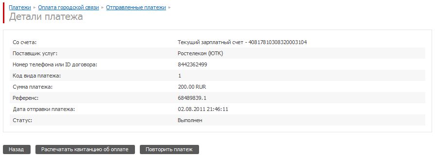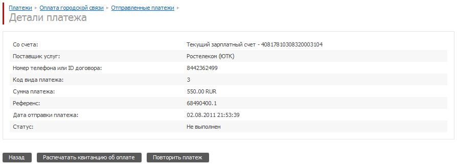 вопрос знатокам. вчера, вследствие природной лени, попробовал оплатить услуги Ростелеком через альфа-клик. Соответственно, при выборе этого оператора, мы имеем поля "номер договора" (телефона), "сумма" и некий "код вида платежа" (см. рисунок 1). Методом научного тыка я понял, что "код вида платежа" - это то же, в каком порядке балансы идут в личном кабинете. 1-для абонентской платы за линию и местные вызовы; 2-для междугородних вызовов; 3-интернет. Однако, если 1 и 2 платежи тут же прошли, то третий получил статус "не выполнен" (см. рисунки 2, 3, 4). И баланс интернета, соответственно, не изменился (см. рисунок 5). Что я сделал неправильно?..