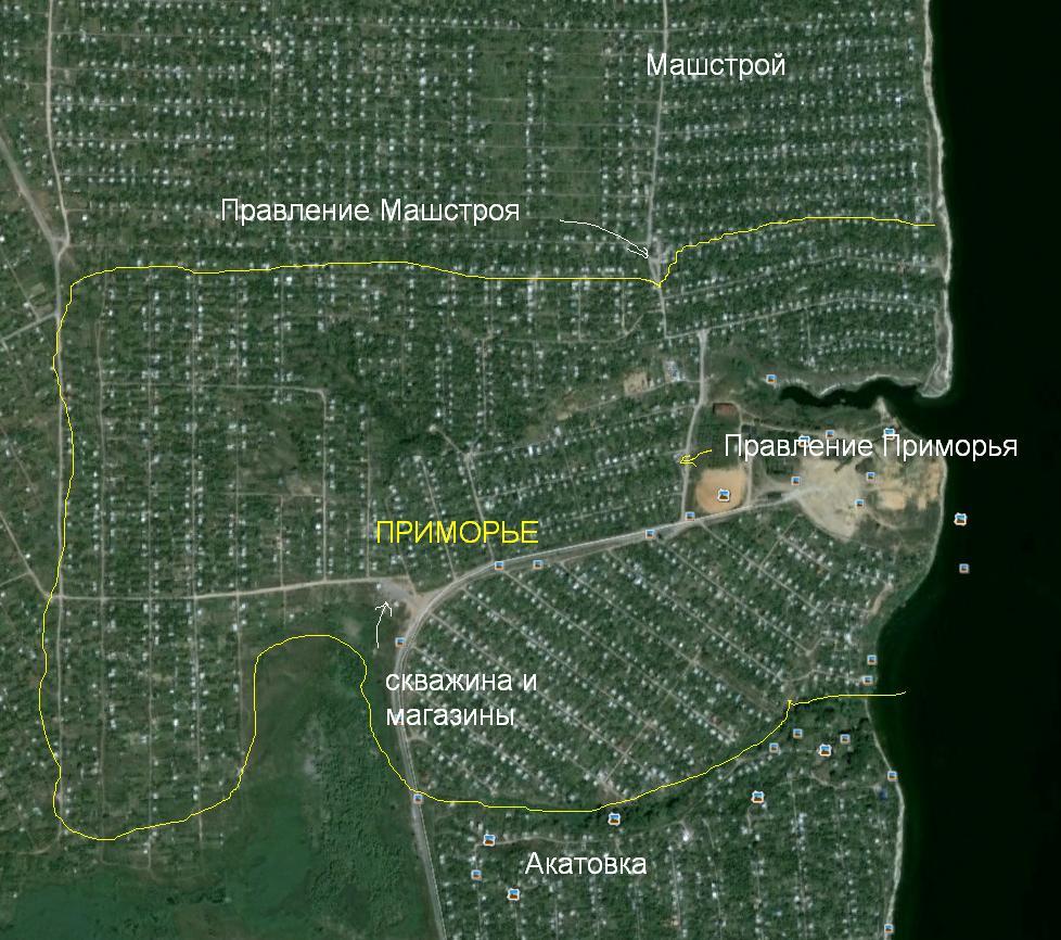 Ошибаетесь, "Приморье", это как раз конечная 109 с кучей песка , примерно 0,5-1,5 км в радиусе от остановки (зависит от направления). А вот если 0,5 км через "Приморье" проехать, то начнется "Машстрой", там у них как раз от их правления массив начинается. А с другой стороны (через ручей от родника в сторону города) - Акатовка. Сверху - Русь