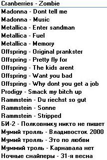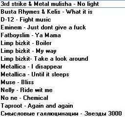 С Музлом пока только 5 дисков... там нового нет (почти). ДИСК I 1.Incubus Make yourslef Morning view 2.Methods of mayhem Methods of mayhem 3.Red hot chili peppers By the way 4.Zemfira Прости меня моя любовь 5.Ленинград Дачники Маде ин жопа Мат без электричества Пираты XXI века Пуля Пуля (Диск 1) Пуля (Диск 2) Тексты Ленинград ДИСК II 1.Bon Jovi Bounce 2.Guano apes Don't give me names Don't you your beck on me turn Тексты Guano apes Фото Guano apes 3.Papa roach Lovehatetragedy Тексты Papa roach Фото Papa roach 4.System of a down System of a down Toxicity Текст System of a down Фото System of a down 5.Vopli vidopliassova Fayno 6.Сергей Шнуров Второй Магаданский 7.Сплин 25 кадр Гранатовый альбом ДИСК III 1.Everlast Eat at whitey's 2.Goo goo dols Gutterflower 3.Machine head The burning red 4.Megaherz Herzwerk II 5.Molotov Donde jugaran las ninas 6.Rammstein Herzeleid Mutter Rammstein' text Разное 7.Tanzwut Tanzwut 8.Vidoedrone Vidoedrone ДИСК IV 1.Bomfunk mc's Burnin' sneakers 2.Das ich Anti'christ Das ich' photo Das ich' text Re laborat 3.Kramm Coeur 4.Zемфира Singles До свидания Земфира Земфира + Rammstein Трафик Фото Zемфира Четырнадцать недель тишины ДИСК V 1.Alien ant farm Alien ant farm 2.Nickelback Curb Silver side up 3.Sugar ray Lemonade & brownies 4.Король и Шут Акустический альбом Будь как дома, путник Герои и злодеи Ели мясо мужики Жаль, нет ружья Как в старой сказке Камнем по голове Король и шут Тексты Король и Шут Фотки Король и Шут 5.Танцы минус Флора-фауна