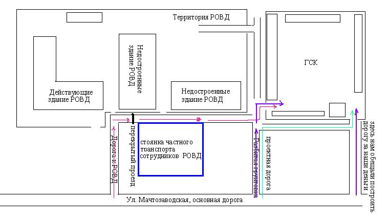 Конечно же ни кто не согласился строить эту дорогу всех устраивало подъезд через РОВД и цена была заоблачной. На собрании был задан вопрос о проектной дороге к ГСК, на что председатель ответил, что по проекту положена дорога которая ведёт к хозяйственным зданиям и постройкам РОВД, и от неё к ГСК. Хозяйственные постройки РОВД, в начале 90-х были заморожены и стоят недостроенными, естественно дорога тоже, сейчас она разбитая грунтовая, по которой мы и заезжаем теперь. Её типа должна строить милиция, по проекту... вопрос остался открытым.