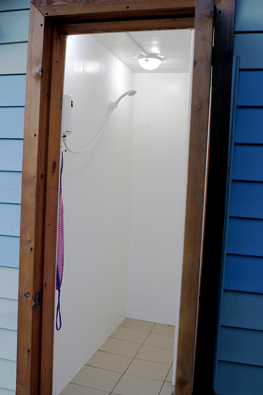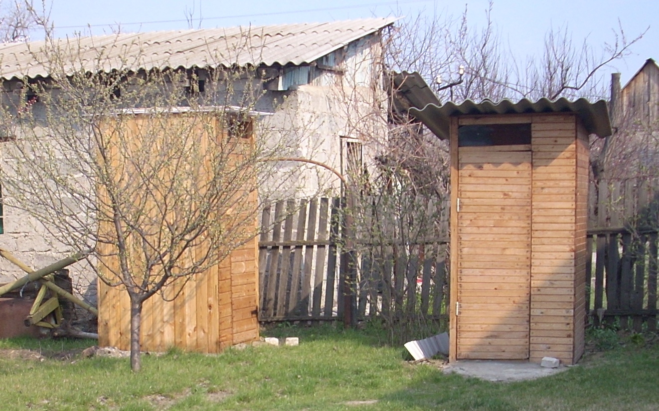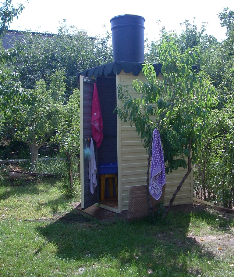 kotopes, делали сами. За выходные поставили. На крышу хорошо бы таблетку, вместо бочки. Но эта бочка тоже душевая. На другой даче душ деревянный. Слева душ, справа тулялет. Этот душ покупной. Что-то 1,5-2 тыр стоил. Но за деревом уход нужен.