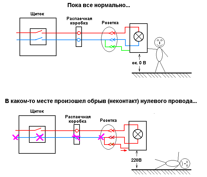 Теперь обратите внимание на рисунок: Схема заземления TN-C. И посмотрите как делится PEN проводник, он используется как "0", и как СУП, электроустановки! По ПУЭ электроустановка это целое здание, с ее коммуникациями, а не отдельный чайник или пылесос ---------- Сообщение добавлено 04.07.2011 14:48 ---------- Нет! При обрыве ноля может погореть вся техника, и не только в Ваше квартире. Также будет опасен вынос потенциала на корпус прибора, напруга появится на СУП и мы вернемся к топик стартеру.