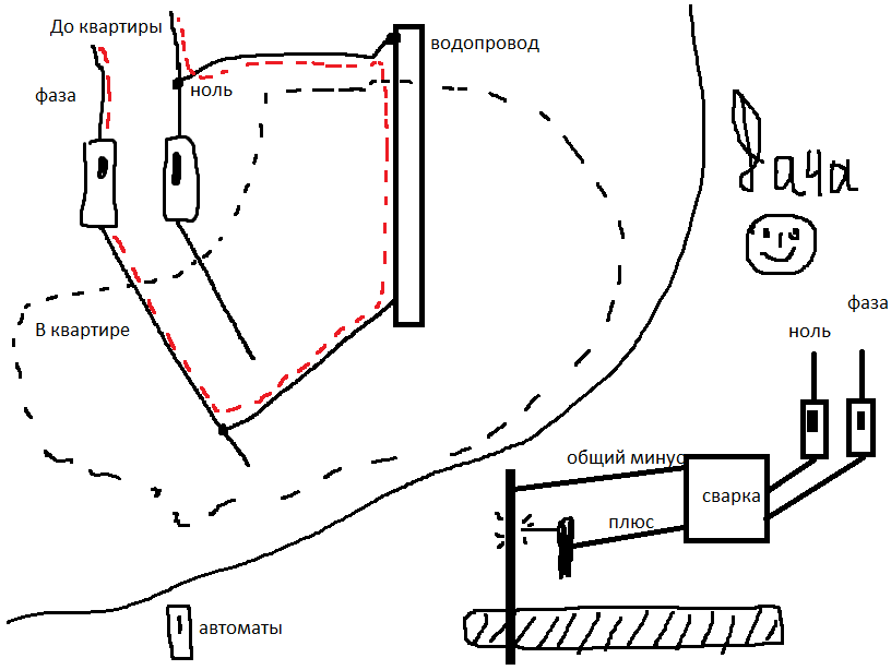 Просто я уже как в детсаду пытаюсь, не поймет меня фазурик Какая разница какой путь - главное пробки выбъет!!! В паинте нарисовал художество - максимально просто и понятно. Суть его такова, что если где-то за пределами квартиры водопроводные трубы имеют контакт с нулем, то пробки выбъет! Красным обозначен путь тока. Если контакт плохой, есть определенное сопротивление, то выбъет или нет зависит от величины тока, на который рассчитаны автоматы, а так же от сопротивления. Ниже картинка с дачи