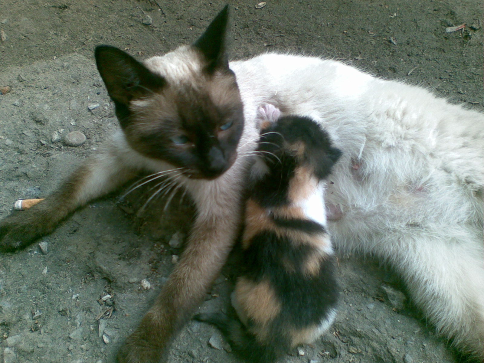 4 котенка, 2 трехцветных, 2 белых. Пока еще маленькие, на вид неделе 2. Кошка и котята живут на улице, в оборудованной для них коробке у подъезда, жильцы дома подкармливают, да и я тоже. Пол котят рассмотреть не удалось, тк кошка спрятала их за рамами окна. Кошечка очень добрая, мурлыка. по всей видимости выкинутая кем то на улицу. Решила помочь котяткам в обретении семьи.