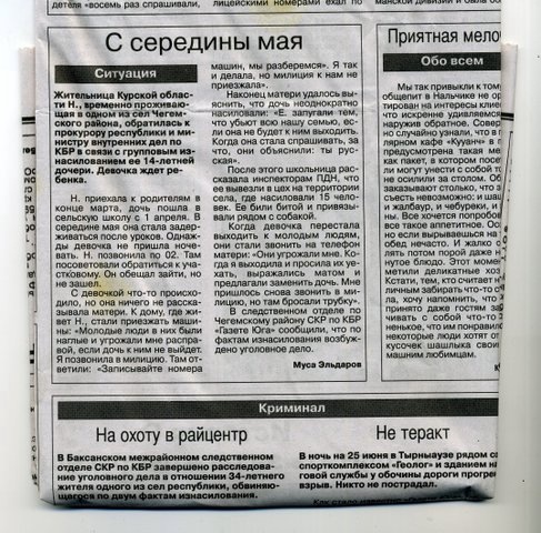 Жительница Курской области Н, временно проживающая в одном из сел Чегемского района, обратилась к прокурору республики и министру внутренних дел по КБР в связи с групповым изнасилованием ее 14-летней дочери. Девочка ждет ребенка. Н. приехала к родителям в конце марта, дочь пошла в сельскую школу с 1 апреля. В середине мая она стала задерживаться после уроков. Однажды девочка не пришла ночевать. Н. позвонила по 02. Там посоветовали обратиться к участковому. Он обещал зайти, но не зашел. С девочкой что-то происходило, но она ничего не рассказывала матери. К дому, где живет Н., стали приезжать машины. *«Молодые люди в них были наглые и угрожали мне расправой, если дочь к ним не выйдет. Я позвонила в милицию. *Там ответили: «Записывайте номера машин, мы разберемся». Я так и делала, но милиция к нам не приезжала». Наконец матери удалось выяснить, что дочь неоднократно насиловали. «Е. запугали тем, что убьют всю нашу семью, если она не будет к ним выходить. Когда она стала спрашивать,*за что, они объяснили: ты русская». После этого школьница рассказала инспекторам ПДН, что ее вывезли в цех на территории села, где насиловали 15 человек. Ее били битой и привязывали рядом с собакой. Когда девочка перестала выходить к молодым людям, они стали звонить на телефон матери: »Они угрожали мне. Когда я выходила и просила их уехать, выражались матом и предлагали заменить дочь. Мне пришлось снова звонить в милицию, но там бросали трубку». В следственном отделе по Чегемскому району СКР по КБР «Газете Юга» сообщили, что по фактам изнасилования возбуждено уголовное дело. Мусса Эльдаров Газета "Голос Юга" №26, Нальчик, 30 июня с.г.