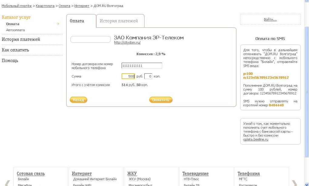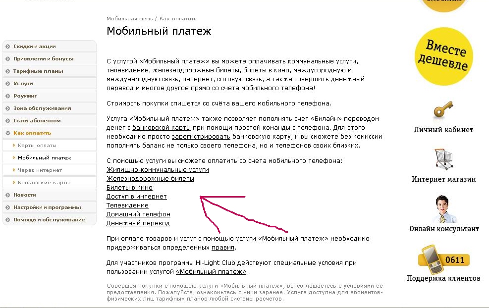 как можно оплатить с мобильного за дом/телефон и инет? без отправки смс. на сайте Билайна оплатить за телефон как-то не получается,