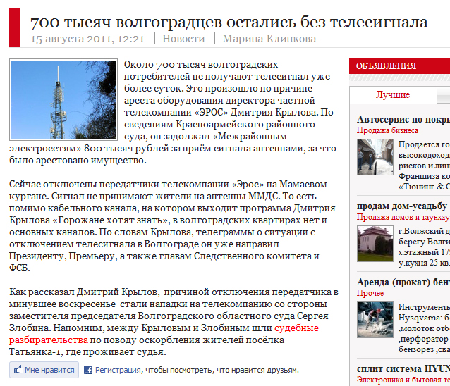 Купил антенну ММДС 2 недели назад. Отдал 1000 руб. Еще толком поставить не успел... а тут вот такая политика разигралась. Буду отстаивать свои вложения на стороне Крылова. Форумчане - не забывайте про частный сектор - нам отсупать некуда - к нам кабель никогда не протянут!!!!!!!!!! ---------- Сообщение добавлено 15.08.2011 22:18 ----------