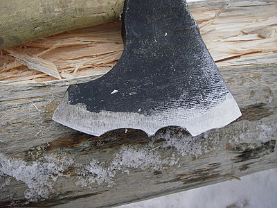 чеж вы им рубите?) За всю жизнь только раз видел похожие повреждения у топора. Когда его кувалдой вбивали в бревно.