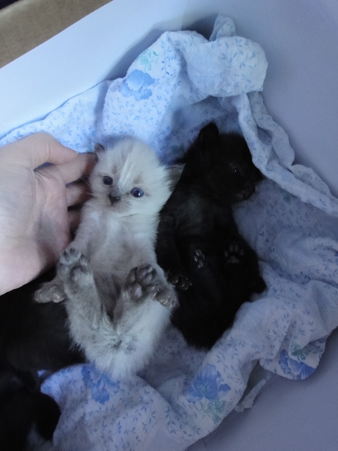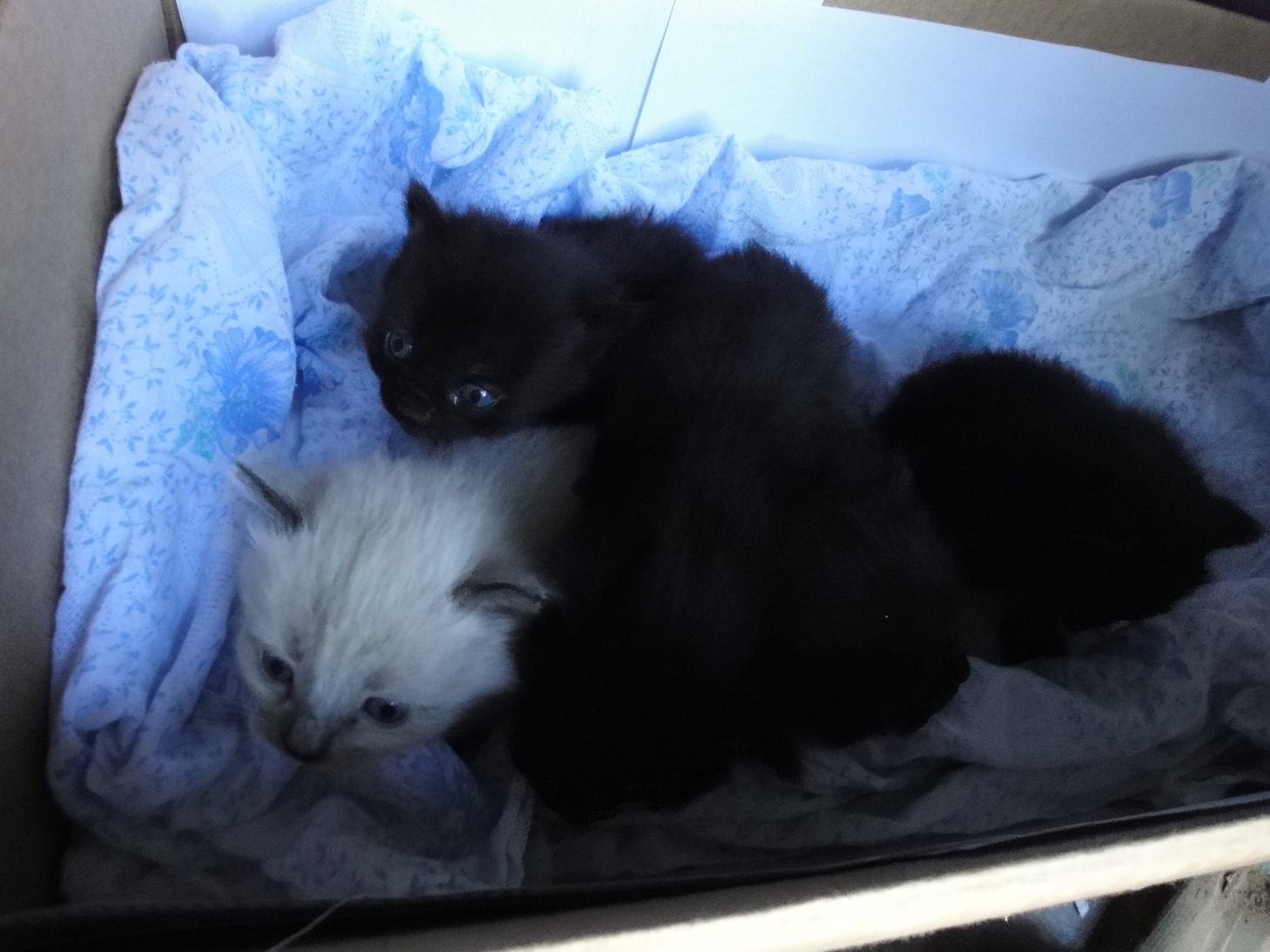 Приветствую! Кошка в подъезд принесла котят. Три девочки (две черные, одна сиамского окраса), два мальчика (черные). На вид им месяц или чуть больше (не очень хорошо в этом разбираюсь). Все здоровенькие, чистые. Мама-кошка умничка, ласковая, черепахового окраса с зелеными глазами. Мы одного черненького котика-мальчика забираем. Итого 4 бездомных котенка ищут своих хозяев. Совершенно бесплатно. Может есть кто неокотяченный? Малыши подрастают, начинают расползаться по подъезду, народ здесь местами не очень доброжелательный, боюсь как бы не повыбрасывали их. Обращайтесь по тел. 8-909-378-79-82