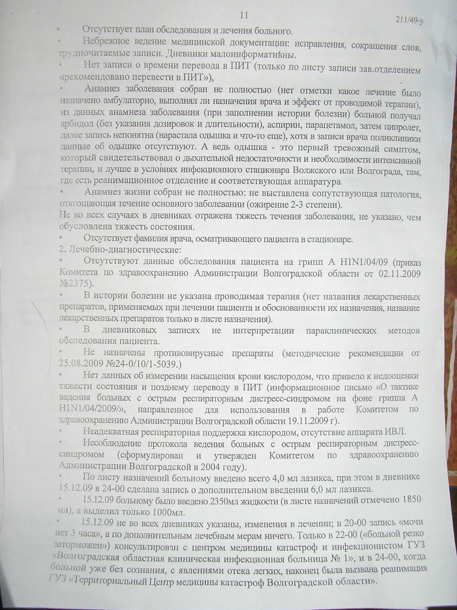 Единственный документ регламентирующий деиствия медперсонала, и способы оказания помоши больным гриппом А с дистресс синдромом, на момент события (это 8-14 декабря 2009 года) - это внутренний документ облздрава, которого я что-то как то не нашел у них на сайте.