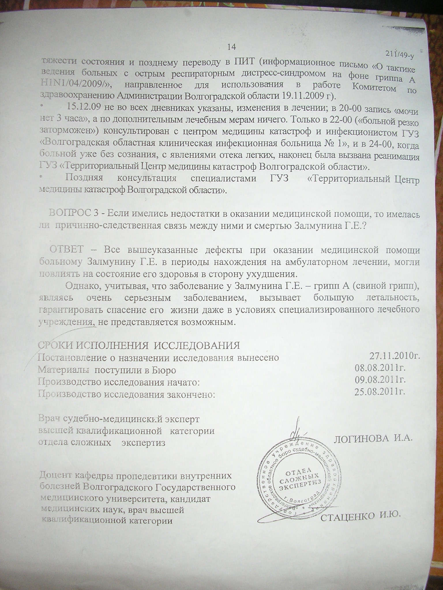 При этом в материалах проверки, существовало расхождение - опрос непосредственных участников показывал что обращение в скорую поступило на 2 день заболевания, а не за день до смерти, как это указано в служебной проверке.