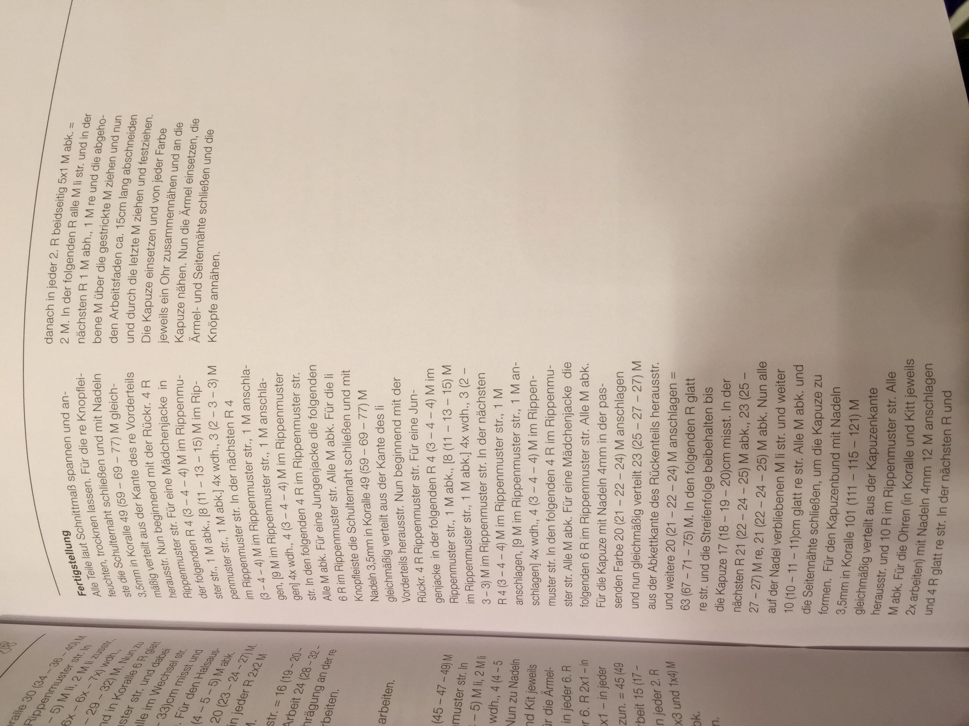 Маришка, у меня тоже со временем не очень. Что смог Вот оригинал в текстовом формате: Спойлер Fertigstellung Alle Teile laut Schnittmaß spannen und anfeuchten, trocknen lassen. Für die re Knopfleiste die Schulternaht schließen und mit Nadein 3,5mm in Koralle 49 (59 - 69 - 77) M gleichmäßig verteilt aus der Kante des re Vorderteils herausstr. Nun beginnend mit der Rückr. 4 R Rippenmuster str. Für eine Mädchenjacke in der folgenden R 4 (3 - 4 - 4) M im Rippenmuster str., 1 M abk., [8 (11 - 13 - 15) M im Rippenmuster str., 1 M abk.] 4x wdh., 3 (2 - 3 - 3) M im Rippenmuster str. In der nächsten R 4 (3 - 4 - 4) M im Rippenmuster str., 1 M anschlagen, [9 M im Rippenmuster str., 1 M anschlagen] 4x wdh., 4 (3 - 4 - 4) M im Rippenmuster str. In den folgenden 4 R im Rippenmuster str. Alle M abk. Für eine Jungenjacke die folgenden 6 R im Rippenmuster str. Alle M abk. Für die li Knopfleiste die Schulternaht schließen und mit Nadeln 3,5mm in Koralle 49 (59 - 69 - 77) M gleichmäßig verteilt aus der Kante des li Vorderteils herausstr. Nun beginnend mit der Rückr. 4 R Rippenmuster str. Für eine Jungenjacke in der folgenden R4 (3- 4-4) M im Rippenmuster str., 1 M abk., [8 (11 - 13 - 15) M im Rippenmuster str., 1 M abk.] 4x wdh., 3(2- 3-3) M im Rippenmuster str. In der nächsten R 4 (3 - 4 - 4) M im Rippenmuster str., 1 M anschlagen, [9 M im Rippenmuster str., 1 M anschlagen] 4x wdh., 4 (3 - 4 - 4) M im Rippenmuster str. In den folgenden 4 R im Rippenmuster str. Alle M abk. Für eine Mädchenjacke die folgenden 6 R im Rippenmuster str. Alle M abk. Für die Kapuze mit Nadeln 4mm in der passenden Farbe 20 (21 - 22 - 24) M anschlagen und nun gleichmäßig verteilt 23 (25 - 27 - 27) M aus der Abkettkante des Rückenteils herausstr. und weitere 20 (21 - 22 - 24) M anschlagen = 63 (67 - 71 - 75) M. In den folgenden R glatt re str. und die Streifenfolge beibehalten bis die Kapuze 17 (18 - 19 - 20)cm misst. In der nächsten R 21 (22 - 24 - 25) M abk., 23 (25 - 27 - 27) M re, 21 (22 - 24 - 25) M abk. Nun alle auf der Nadel verbliebenen M li str. und weiter 10 (10 -11 - 11)cm glatt re str. Alle M abk. und die Seitennähte schließen, um die Kapuze zu formen. Für den Kapuzenbund mit Nadeln 3,5mm in Koralle 101 (111 - 115 - 121) M gleichmäßig verteilt aus der Kapuzenkante herausstr. und 10 R im Rippenmuster str. Alle M abk. Für die Ohren (in Koralle und Kitt jeweils 2x arbeiten) mit Nadeln 4mm 12 M anschlagen und 4 R glatt re str. In der nächsten R und danach in jeder 2. R beidseitig bxl M abk. =2 M. In der folgenden R alle M li str. und in der nächsten R 1 M abh., 1 M re und die abgehobene M über die gestrickte M ziehen und nun den Arbeitsfaden ca. 15cm lang abschneiden und durch die letzte M ziehen und festziehen. Die Kapuze einsetzen und von jeder Farbe jeweils ein Ohr zusammennähen und an die Kapuze nähen. Nun die Ärmel einsetzen, die Ärmel- und Seitennähte schließen und die Knöpfe annähen. Что за фигня? Почему теги не работают?!