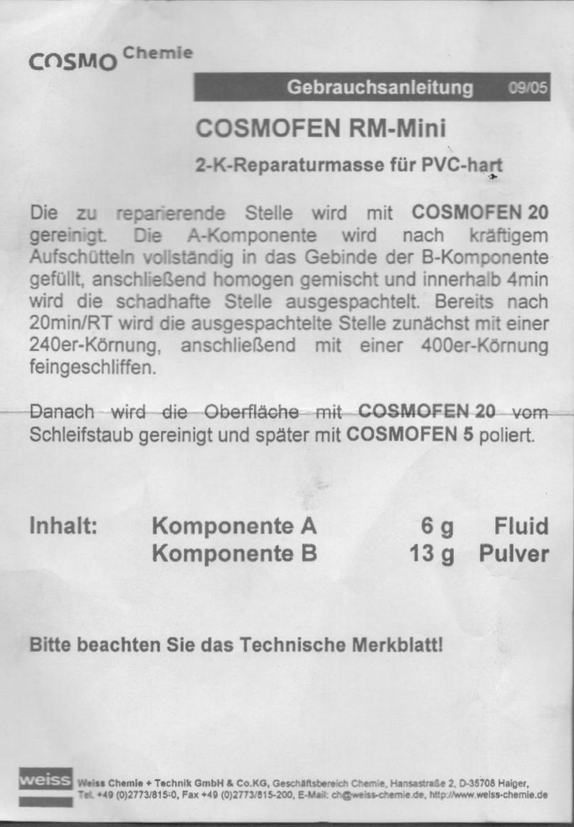 Короче. Это двухкомпонентный состав для ремонта. Ремонтируемое место чистится с COSMOFEN 20. Компоненты А и В смешивается до однородного состояния в течении 4 мин. Штукатурится. Через 20 мин можно шлифовать сначала гранулами 240, затем 400. Позже поверхность с COSMOFEN 20 чистится и с COSMOFEN 5 полируется. Содержание компонента А 6 г - жидкое, В 13 г - порошок. Только хз, это содержание упаковки или пропорции для замеса. Ну и просят на памятку внимание обратит. Как-то так. Но это очень приблизительно