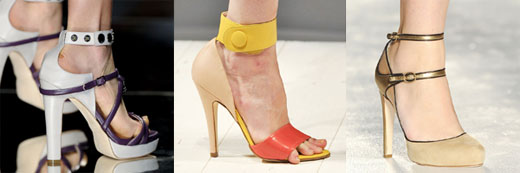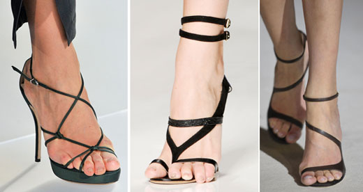 Это правда. Шею визуально оно убирает совсем, торс должен быть длинным и, желательно, без бедер. Как у модели на картинке. Женственную фигуру с талией, с большим перепадом между объемом талии и бедер оно сделает короче, рост приземистее. Словом, "комплиментарный вариантик"... Я вот посмотрела новые босоножки, лето 2012. Если даже у моделей пальцы вываливаются, как ходить в таком? Хорошо, что осталось в моде то, что и в прошлом году, + прибавились мюли-"стоптыши" (похожи на "хоттабычи" или полуботинкиботинки со стоптанным задником). Если нас осчастливят таким фасоном - надо прикупить. А вот моделькины пальцы. Наверное, по подиуму шли, выпустив их, как когти орла...