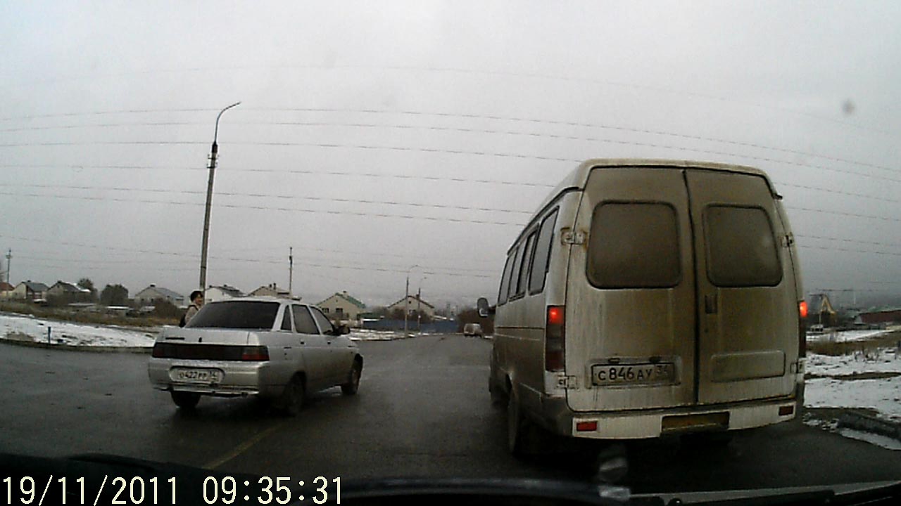 Я поворачиваю налево. Поворотник включен заранее. В зеркале заднего вида вижу летящего по всречке Маршрутка с846ау видит бегущие 10руб и останавливается на перекрестке... на десятке о422рр едет по встречке и чуть не сбивает пешехода, который сломя голову бежит к маршрутке...