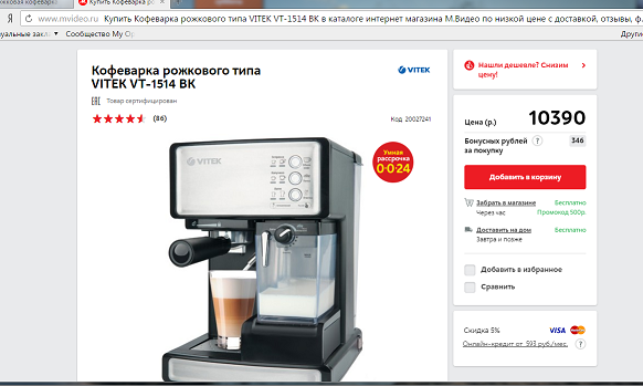Недавно хотела приобрести себе недорогую кофемашину, присматривалась к кофемашине De Longhi ECAM 22.110.B цена 29990р, сейчас со скидкой стоит 24990р. Раньше у меня была рожкового типа, давление 15 бар, Бош. Служила 12 лет. В итоге все же купила опять рожковую, VITEK VT-1514 BK. Скептически относилась к этому бренду, но почитав отзывы, несмотря на то, что консультанты настойчиво рекомендовали более дорогие бренды, взяла именно ее. И очень довольна, что взяла именно ее. Ничего подобного с автоматическим капучинатором по такой цене нет. Кофе достаточно горячий, эспрессо с хорошей толстой пенкой, капучино и латтэ шикарные, слоями как на картинке, есть автоматические режимы и ручные. Я обычно готовлю в ручном режиме сначала эспрессо побольше и покрепче, а потом немного молочной пенки. Готовлю кофе на ней полтора месяца 2-3 раза в день ежедневно. Лаконичный, без наворотов и понтов дизайн. Иногда что-то слегка пощелкивает, присвистывает, громко шумит во время автопромывки, но это мелочи (по такой цене). Кофе варит хорошо, я довольна. Недавно коллега хвалилась своей, оказалось что такая же, как и у меня.