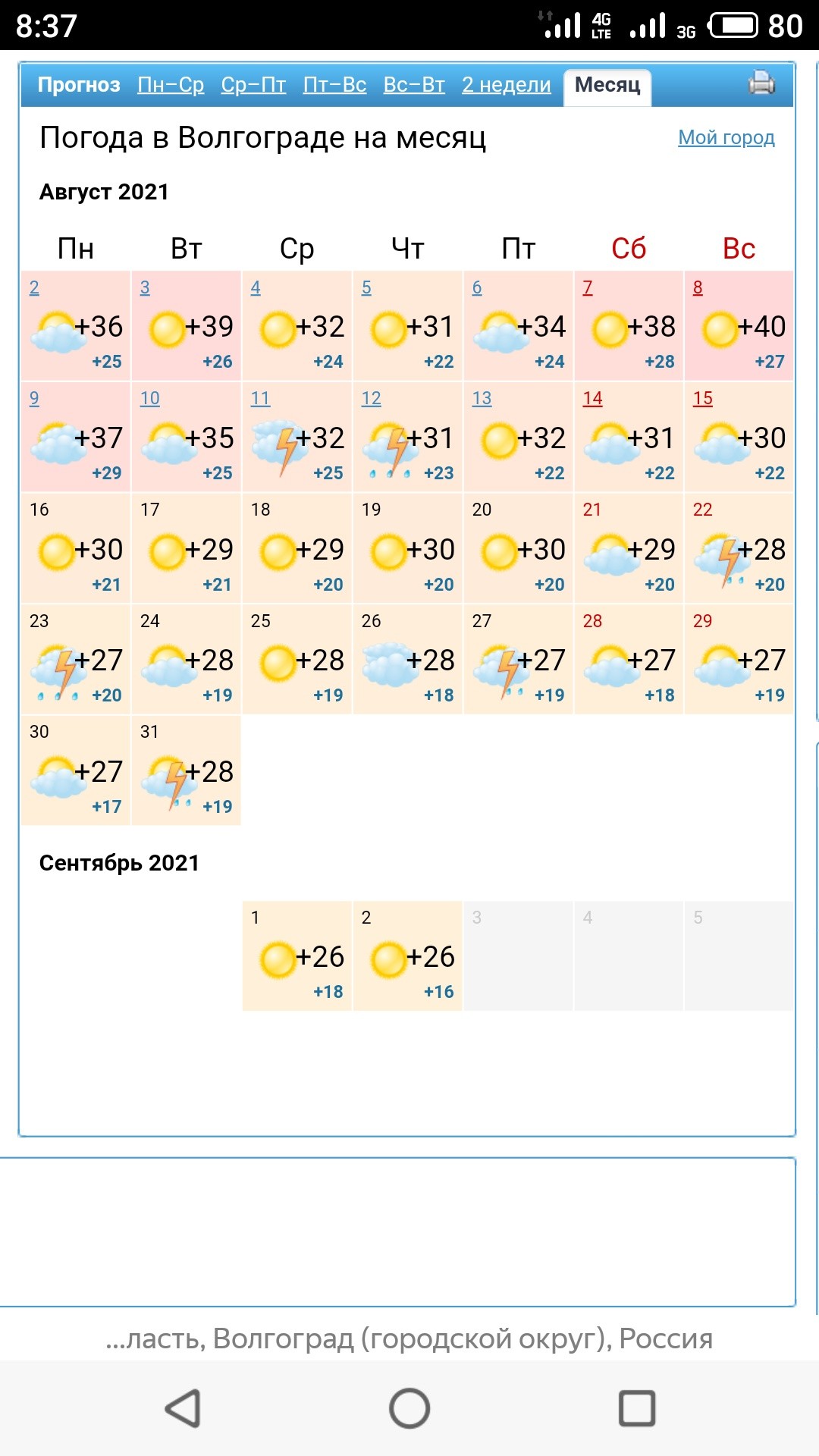 Это где так показывает? Не вижу, какой сайт. Посмотрела ещё раз, выходные 36 максимум. Это все же чуть лучше, не 40, если с ветром и облачно, то вообще норм. А вот завтра... на улицу можно не выходить совсем.