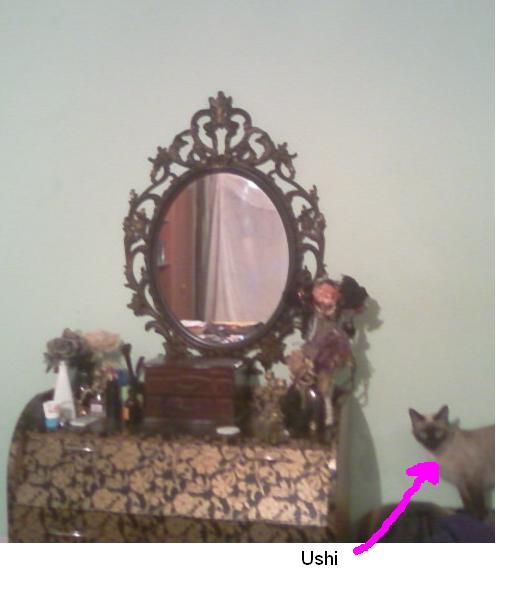 первоначально комод был обычного цвета - песочного, а рамка была для фото - бесцветная, я потом переделала её в полноценное зеркало. Первым слоем рама окрашена акрилом черным, затем, чтобы придать дух старины, нанесён слой бронзового акрила, "трескающаяся краска", издалека смотрится как кованая металлическая рамка, благодаря слою бронзовой краски поверх чёрной, но на фото вам этого не видно, так что верьте на слово. В кадр случайно попала кошечка...