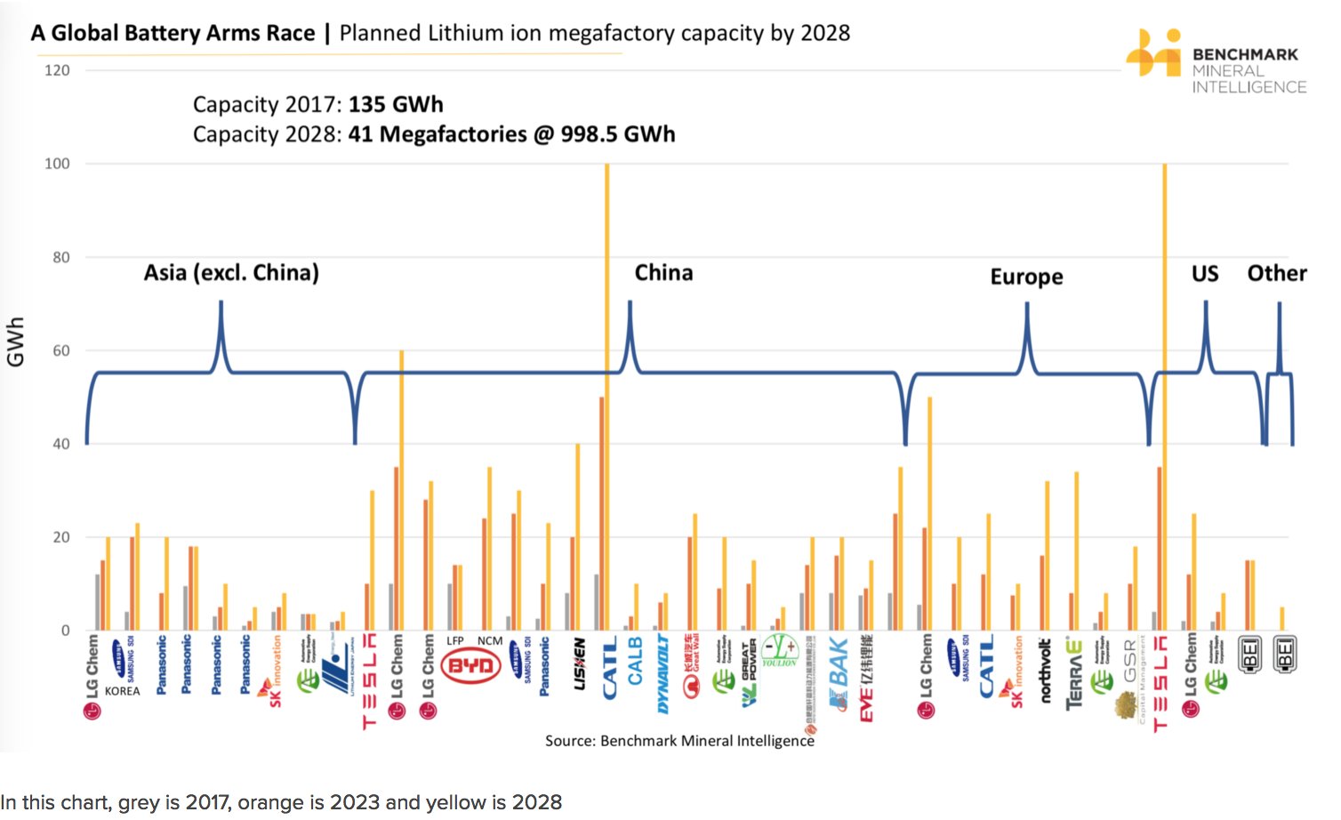 К 2028 запланированы производства батарей суммарным объемом почти в тераваттчас. При 100кВтч на авто получается хранение на 10 миллионов авто в год.