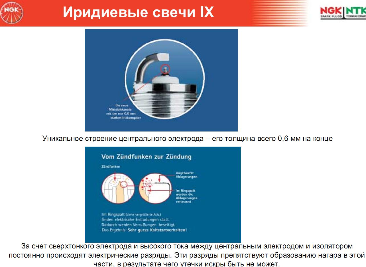 Фишка иридиевых свечей в том, что они имеют сверхтонкий центральный электрод (меньше 1мм). Что дает бОльшую энергию искры. Потому и пробег больше на них, что отложения меньше влияют на работу свечи.