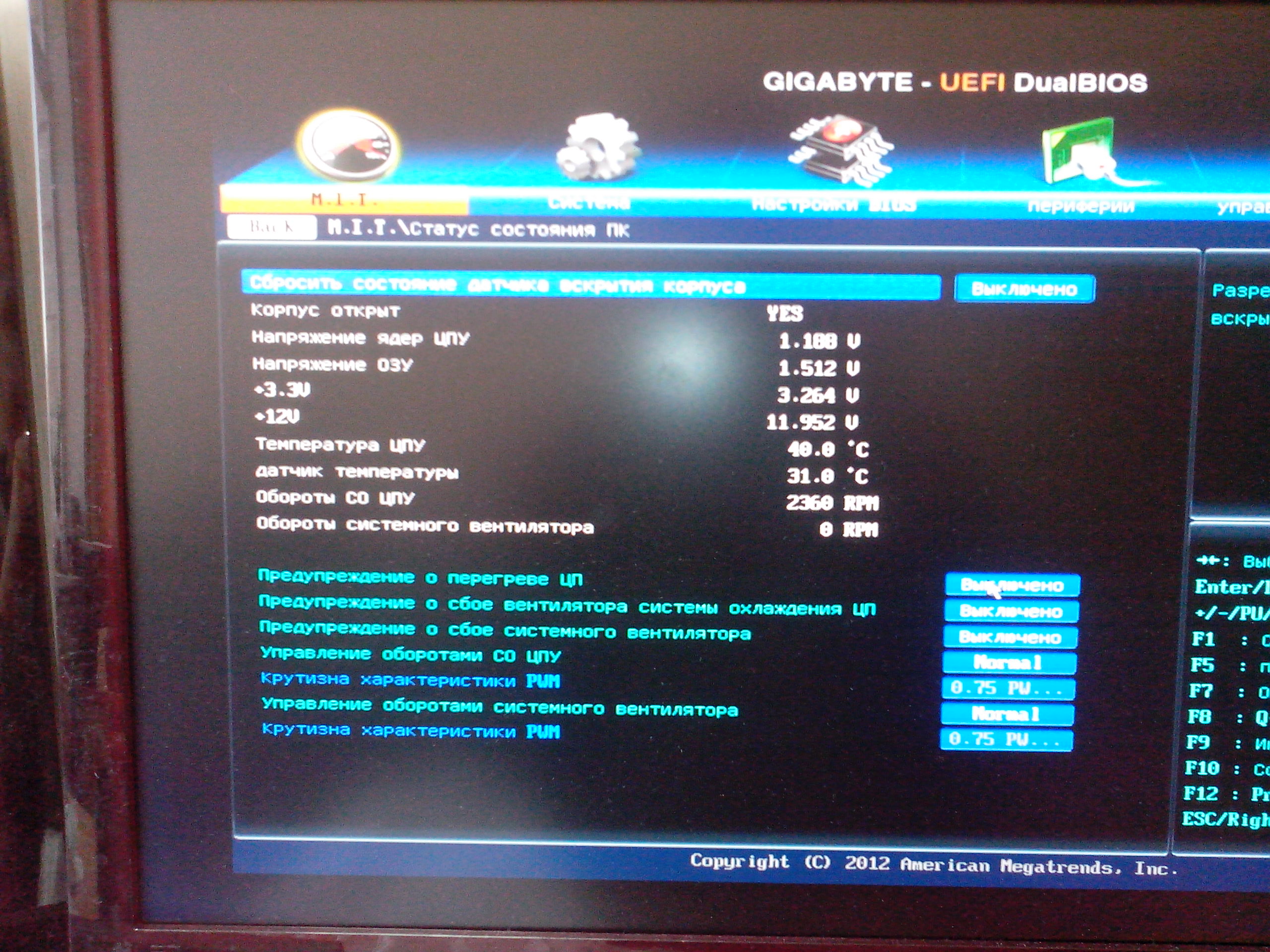 дык посмотрите напруги в биосе\было как-то винт периодически отключался из-за завышенного напряжения по 12в