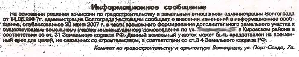 Итогов, прекратите ходить и разговаривать научитесь писать бумаги , желательно грамотные…… используйте на полную гугль, вот я не глядя нашел только что http://www.estateguru.ru/realty/read/Poshagovaja_instrukcija_na_poluchenie_zemli_v_sobstvennost.html хотя лично я советую ориентироваться на условия того, кто открывает дверь- в вашем случае это какой то земельный комитет в мэрии города…….. вот туда напишите для начала глупенькую бумажку –запрос о том, что вы гражданин РФ имеете желание присоединить к своему участку вот этот соседский , но не знаете чево надо делать, что б получить……. В заключении спросите у них что именно вы должны сделать по закону, что б ваша мечта осуществилась……. И ждите ответа…… по закону они должны ответить в полнейшем соответствии с теми законами, которые им известны…….. понятно, что таковое заявление надо нести в мэрию города там в центре и официально регистрировать…….. кстати, можете прямо на имя мэра кто там написать…… ввас даже из приемной пошлют, но спокойненько скажите им, что они не имеют право, а вы имеете…… вот на этой разнице прав и обязанностей наглейте…….. удачи…… ну и какое решение тогда было принято то? В смысле котрое было опубликовано…..полученные вами бумажки – мусор