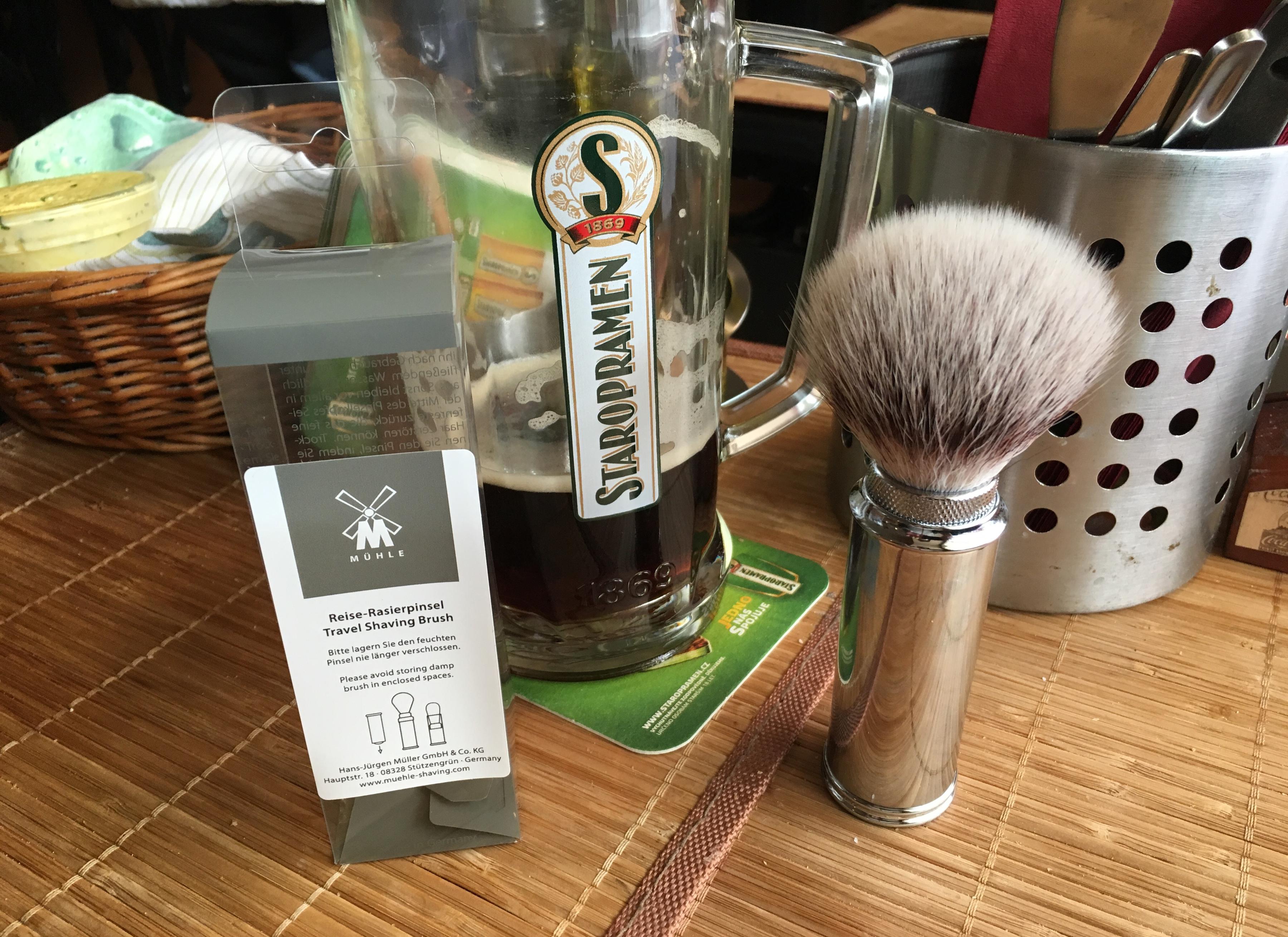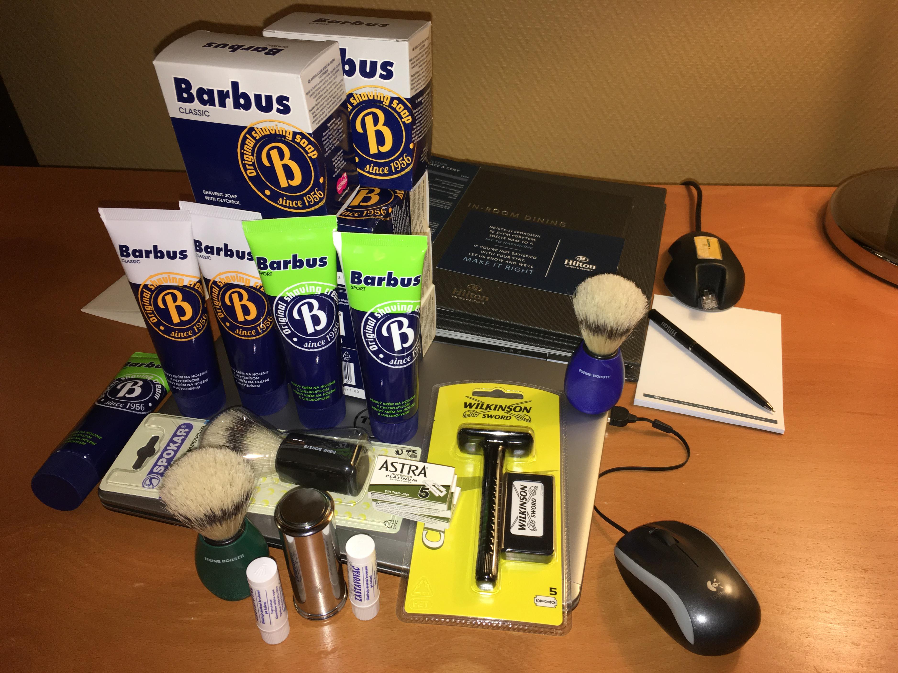 Съездил тут в Прагу, прикупил местного мыла и крема немного, несколько помазков из кабана, лезвий и бальзам после бритья на пиве Ну и бритву Wilkinson другу для приобщения к классическому бритью. Два мыла уже подарил, завтра ещё одно и всё, надо останавливаться в облагодетельствовании, а то самому мало будет. Тем более, что этот Брабус за 2€ оказался лучше американского мыла за 20$. Запах не такой крутой, но бритвенные свойства гораздо лучше.