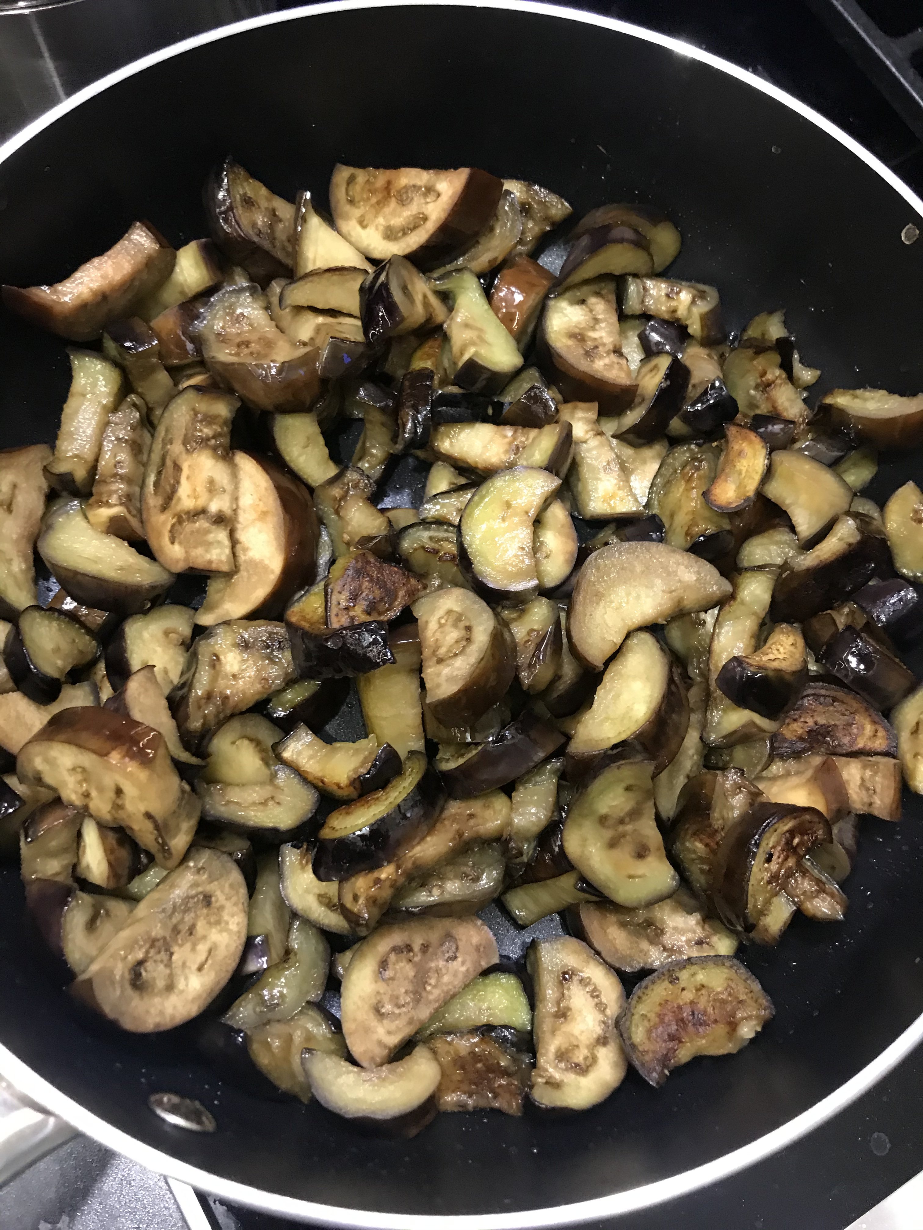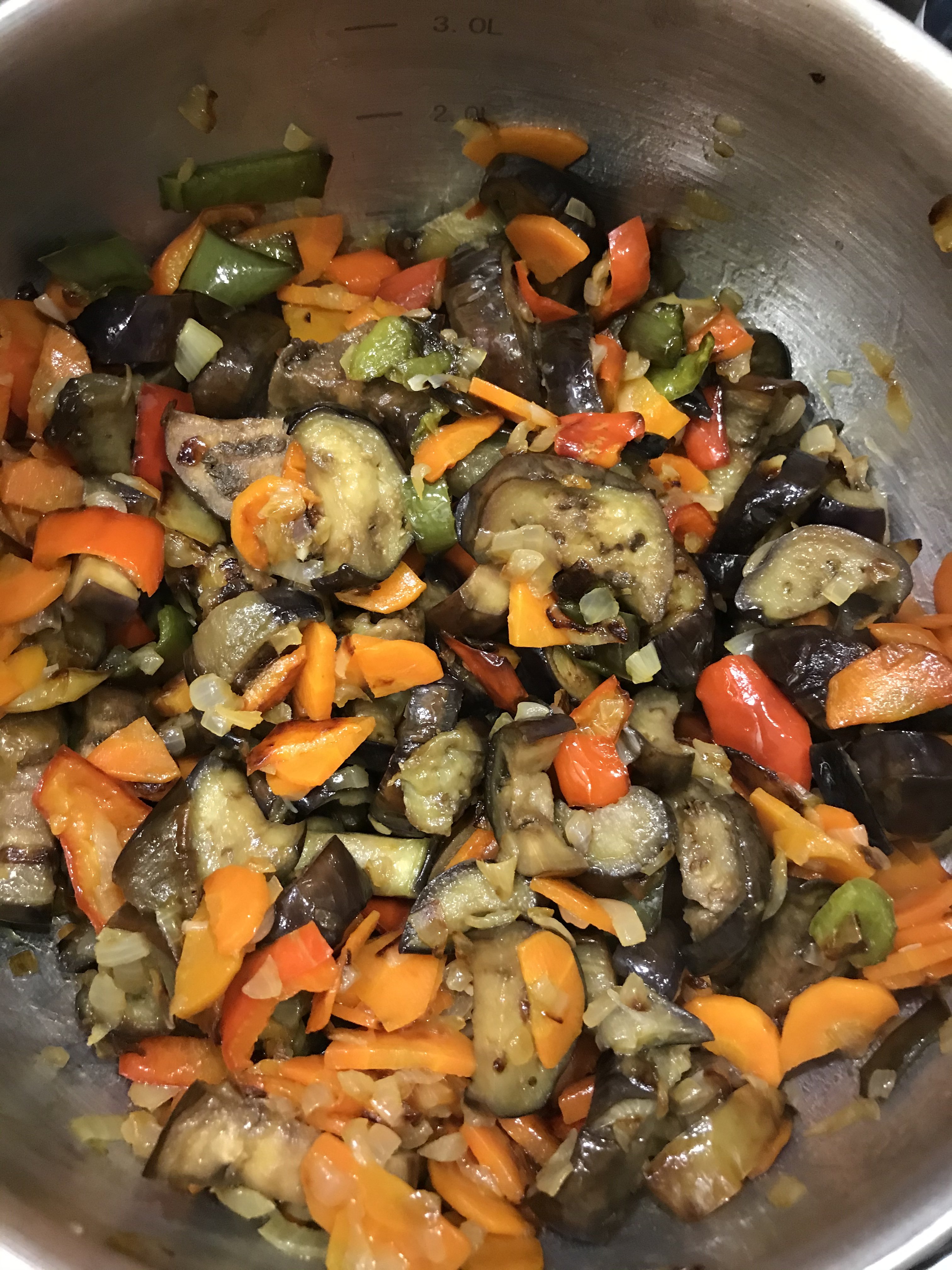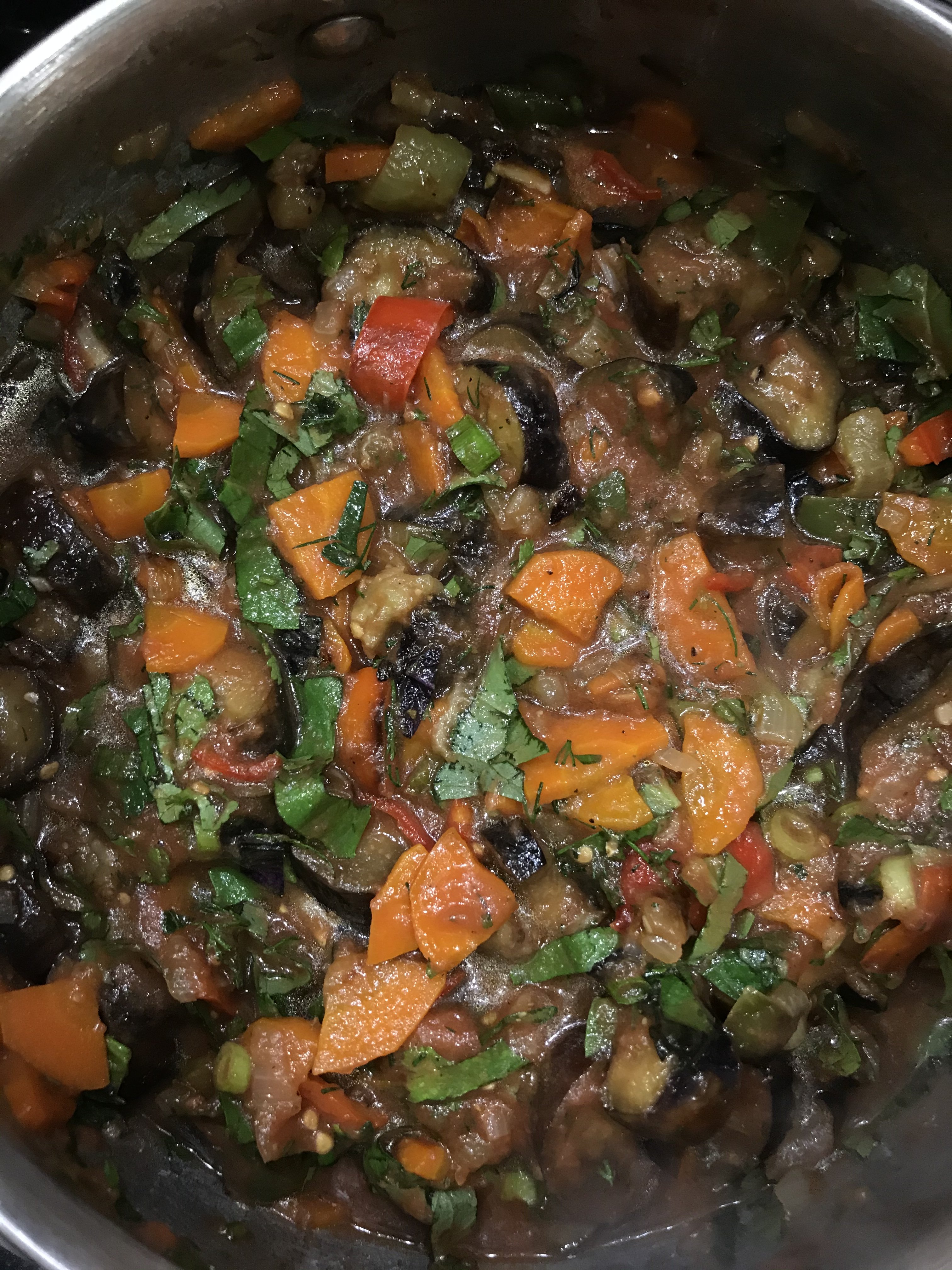 Аджапсандали. Гуглила я рецепты, читала читала и вычитала, что вариаций много) В каждой семье свои нюансы. Кто без моркови, кто картофель или мясо добавляет, кто-то отдельно обжаривает, или запекает, или тушит сразу всё вместе. Я выбрала на первый раз обжарить отдельно. Баклажаны предварительно посыпала солью, оставила на 30 минут, потом помыла и отправила жариться, 15 минут. Переложила в кастрюлю. Обжарила под крышкой болгарский перец, 15 минут и отправила к баклажанам. Лук жарила 3 минуты, добавила морковь, перемешала и жарила под крышкой 20 минут, отправила к баклажанам. Помидоры измельчила (без кожуры) и к баклажанам. Добавила острый перец. Добавила Специи. Тут у меня был сбой, я хотела готовить с уцхо-сунели, но забыла купить, потому, добавляла что было: кориандр, чёрный перец, хмели-сунели (вот вместо хмели, хотела уцхо). Добавила Зелень. Планировала зелёный лук, петрушку, базилик фиолетовый. Всё это было, но добавила ещё укроп, зелёный базилик и часть кинзы. Перемешала, потушила на медленном огне, 15 минут. Вторую часть кинзы измельчила с чесноком и солью и отправила в кастрюлю. Всё перемещала и выключила огонь.