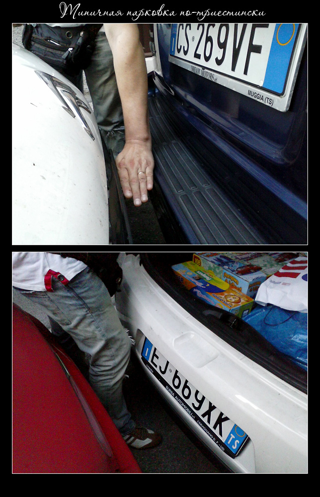 Akvilon, ни разу не угадал. Это типичная парковка между двумя изначально стоящими машинами, осуществлённая сегодня вечером моим мужем. Типичная в смысле -- типичная в нашем городе. Уж прости меня, я была уставшая морально и физически после целого дня шоппинга, чтобы выходить из машины и снимать на видео. Но для тебя что не сделать -- в следующий раз не поленюсь и засниму весь процесс в динамике. Мужу завтра если не повезёт и никто не уехал и на освободившемся месте не припарковался какой скутер или какая малолитражка, кстати, из это жопы мира ещё выезжать как-то придётся... Думаю, пару раз жопой и мордой толкнёт каждого из соседей, но этим у нас никого не удивишь, чуть не у каждой второй машины номера помятые. Я на всякий случай спущусь утром, вдруг и правда будет что снять на видео...
