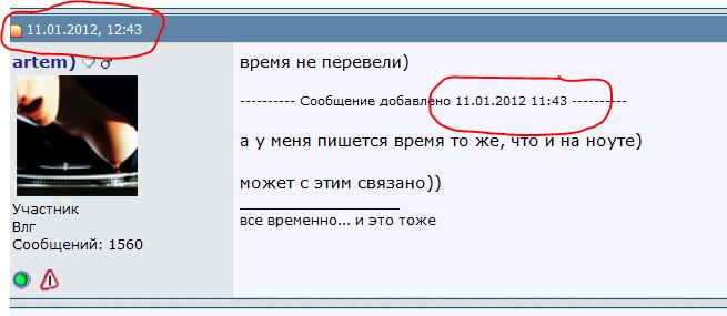 время не перевели) ---------- Сообщение добавлено 11.01.2012 11:43 ---------- а у меня пишется время то же, что и на ноуте) может с этим связано))