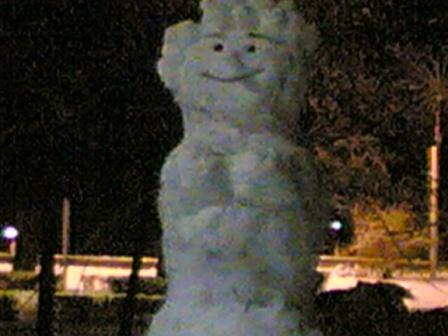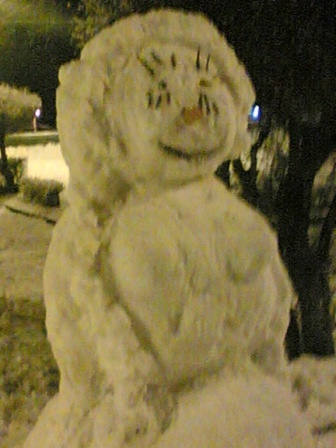 В воскресенье мой дворовый щенок Тимур чуть не охрип: дети на улице играли в снежки. Выйдя вечером на работу, я увидела около дома огромного снеговика... На выходе из Музыкального театра в глаза бросился здоровенный Заяц, такой ушастый, что, отъехав немного, я захотела его снять . Стала искать место припарковаться и обнаружила по всему парку на набережной малые снежные архитектурные формы! Прошла всю набережную. Это было весело, люди с подъемом занимались лепкой и фотографировались. Самих снеговиков можно разделить на три основных группы: люди (мужички - дворники, папы с ребенком; бабищи), звери (мишки, лиса, заяц), небольшие привидения. Эх, наверное, и я сделаю своего снеговичка и украшу ветками от новогодней пихты... Это будет курица на дереве!...