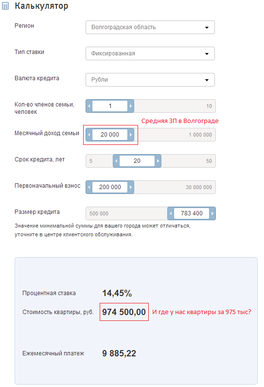 не путайте условия сейчас и условия 5 лет назад, о чем идет рассказ - за время накопления первоначального взноса желаемая кавртира подорожала бы раза в 2 и всю схему пришлось бы переделывать. при доходе 20 круб в месяц надо думать о выживании, а не об ипотеке. А калькулятору пофиг какие цены на рынке.