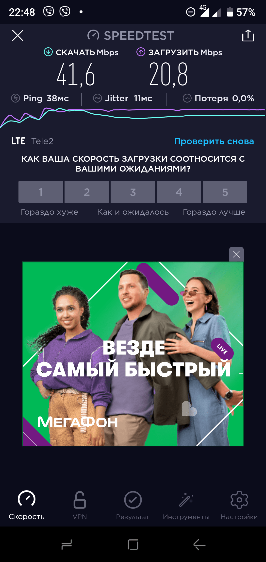 у меня наоборот. теле 2 совсем просел по скорости. щас перешел на мегу. как земля и небо хотя с полгода назад было одинаково. один минус - торренты блочит но это решаемо
