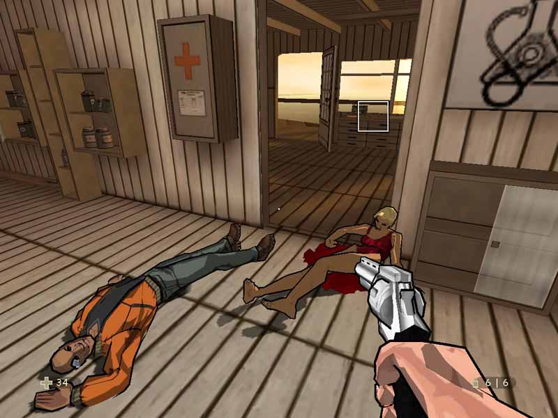 Xiii - одна из немногих игр Fps. которая меня зацепила Игра XIII попала ко мне случайно, вместе в новой видеокартой Radeon 9800. игра на 4 (!) дисках, что уже привлекло внимание. Проинсталлировал ее, думаю посмотрю, что там, как оно полчасика и другими делами займусь. Начал играть и очнулся только через 3 часа. Игра - офигительная. Вкратце, сделана как обычный FPS, но в манере рисованных комиксов. Сюжет - не такой уж и сложный (смесь Хитмана, Макс Пейна и небольшой доли SoF). Но КАК это реализовано! Игрушка затягивает сразу. Дабы не быть голословным выложу несколько скринов и пойду играть дальше. 1. девшука нашла главного героя на пляже и привезла к себе домой... напрасно. прибежали злые уроды, убили девушку, но справедливое возмедие их таки постигло
