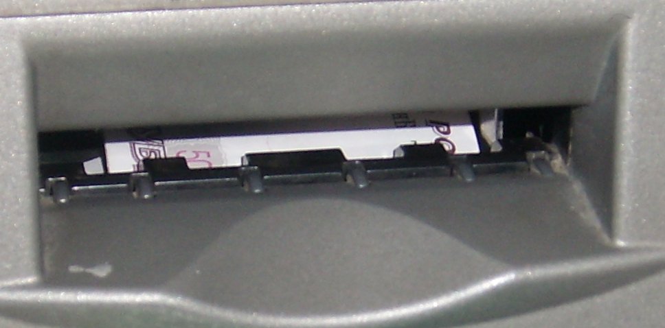 Проверяется высота, ширина и толщина купюры. Туалетная бумага не подойдёт. Когда кассета вставляется в диспенсер, открывается окошко на ней, через которые слистываются купюры. Размеры окошка позволяют пролезть мыши.